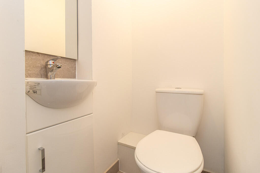 WC Laminate flooring. WC. Vanity wash hand basin with storage beneath and mixer tap above. Extractor fan. Pendant light fitting.