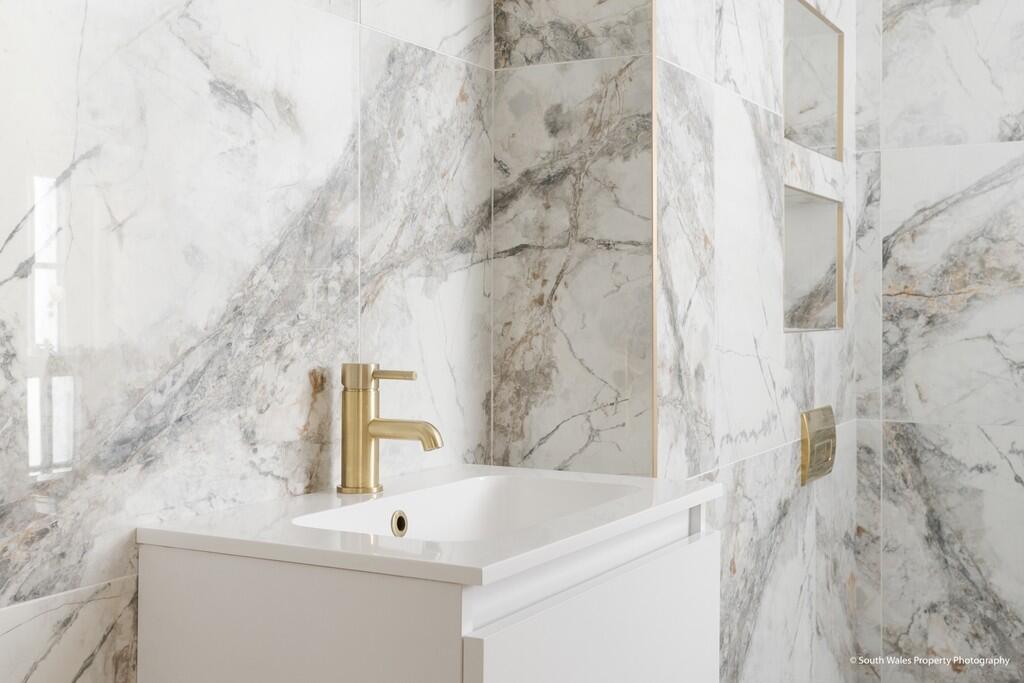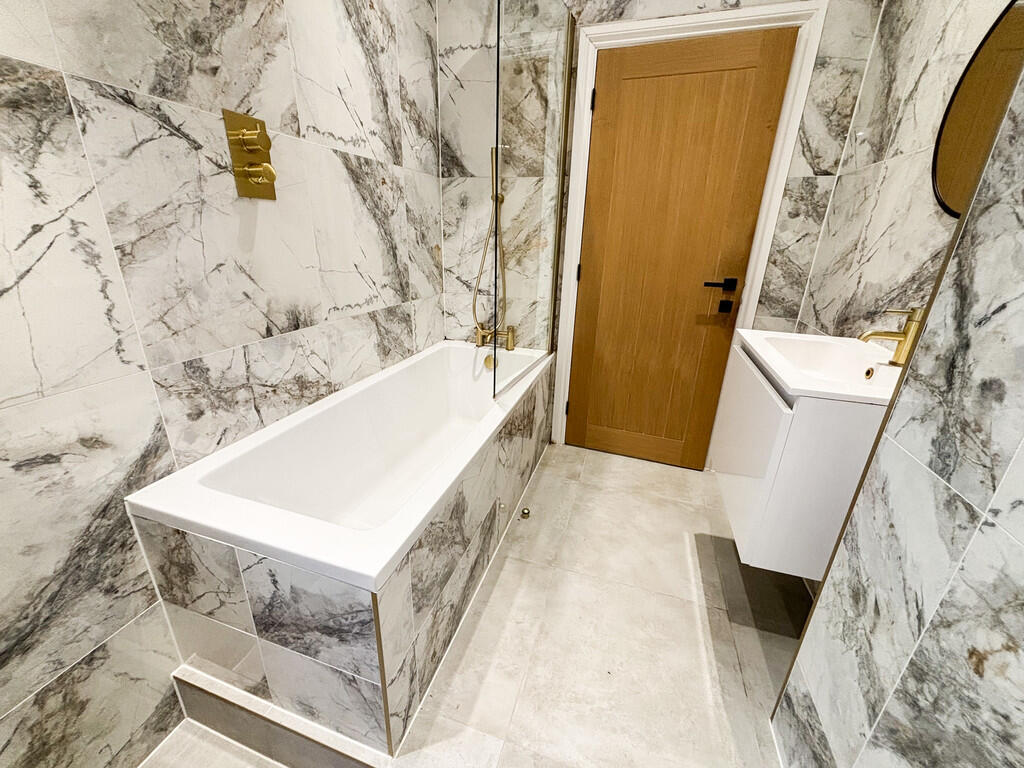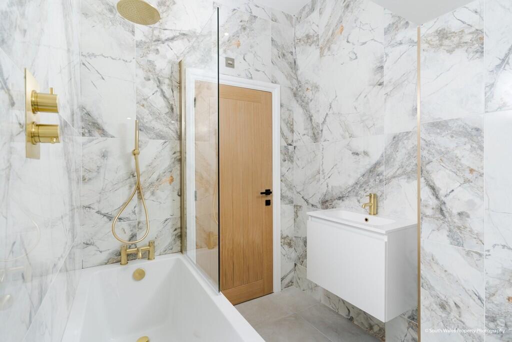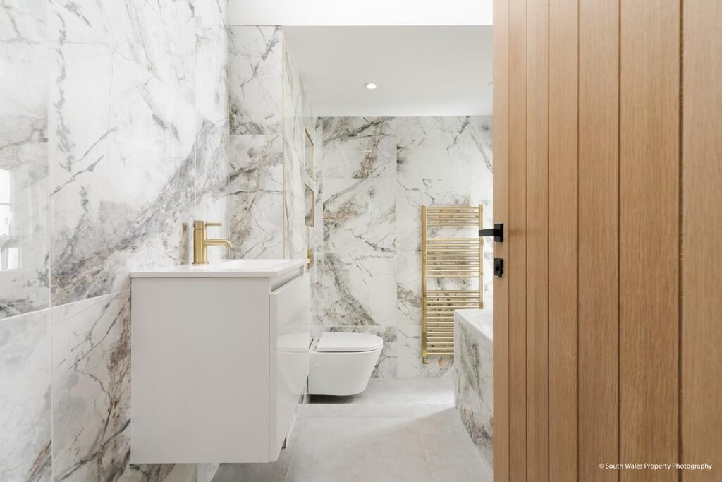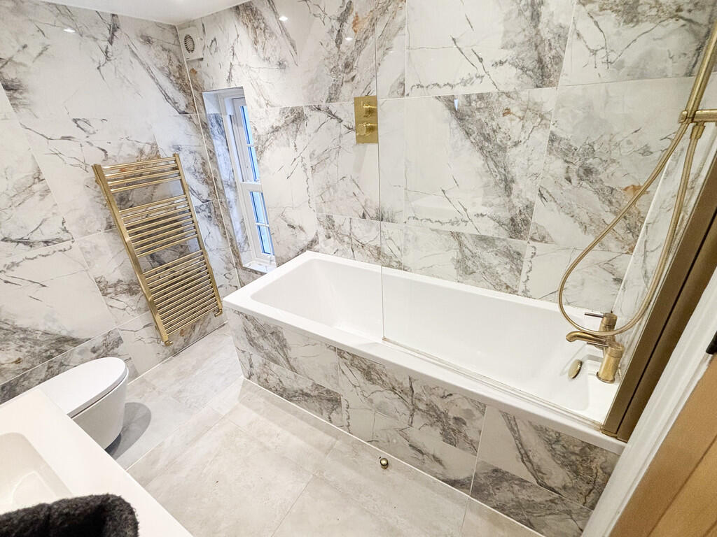 Bathroom(2.50m x 1.82m) <p class="MsoNormal"><b>Gold affect suite comprising of bath with shower above, w.c, hand basin and tall towel rail. Floor to ceiling Calcutta marble style tiling. Window to side. <o:p></o:p></b></p> <p class="MsoNormal"><b> </b></p>