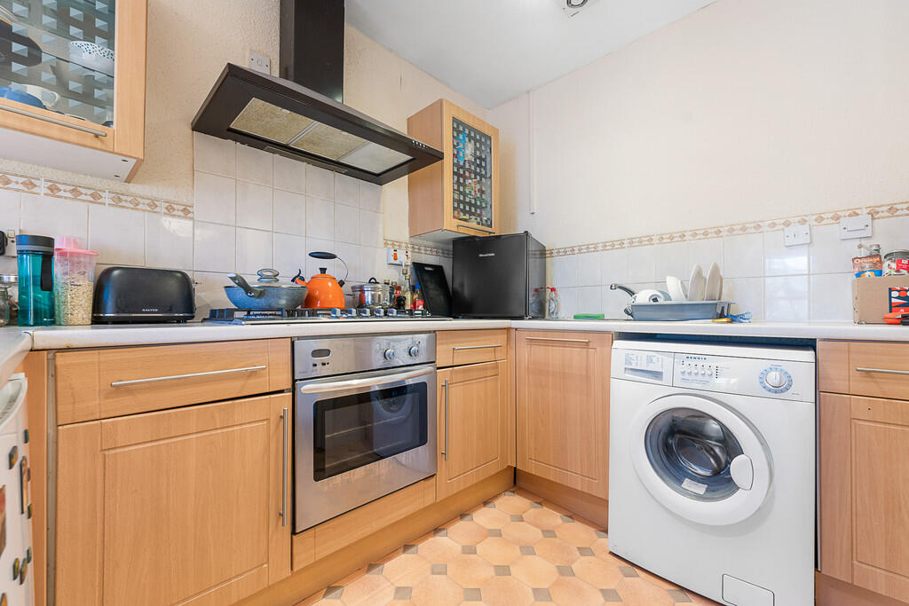 KITCHEN Round edged work surfaces incorporating five ring gas hob with extractor over and stainless sink and drainer with hot and cold tap. Vinyl flooring. Built in electric oven. Space for fridge and washing machine. Wooden storage cabinets across floor and walls. Tiled splashbacks.