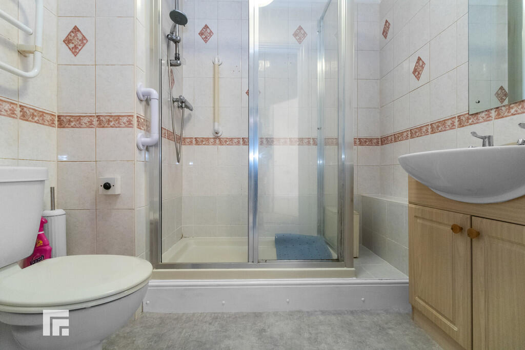 SHOWERROOM6' 9" x 5' 6" (2.08m x 1.70m) White suite comprising low level wc, vanity wash basin with storage below, large shower cubicle. Wall mounted electric heater, electric towel rail and extractor fan. Full wall tiling