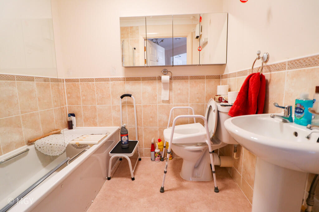 BATHROOM6' 7" x 5' 4" (2.03m x 1.65m) Suite comprises a panelled bath with a thermostatic shower over, pedestal wash hand basin, and a close couple wc. Tiled splash areas. Light/shaver point. Ventilation extractor. Wall mounted heater.