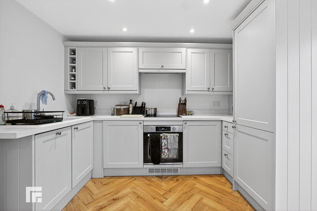 LOUNGE/KITCHEN17' 7" into bay x 11' 1" (5.38m x 3.40m) Double glazed uPVC bay window to front. Double glazed uPVC French doors to rear garden. Radiator. Modern fitted kitchen with work surfaces incorporating composite sink unit with mixer tap. Oven with ceramic hob and extractor over. Built in washing machine, slimline dishwasher and fridge / freezer. Spotlights to ceiling. Laminate flooring.