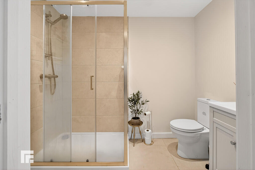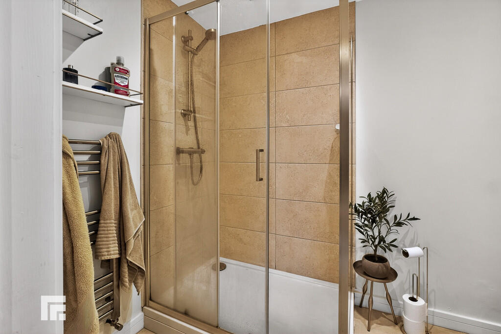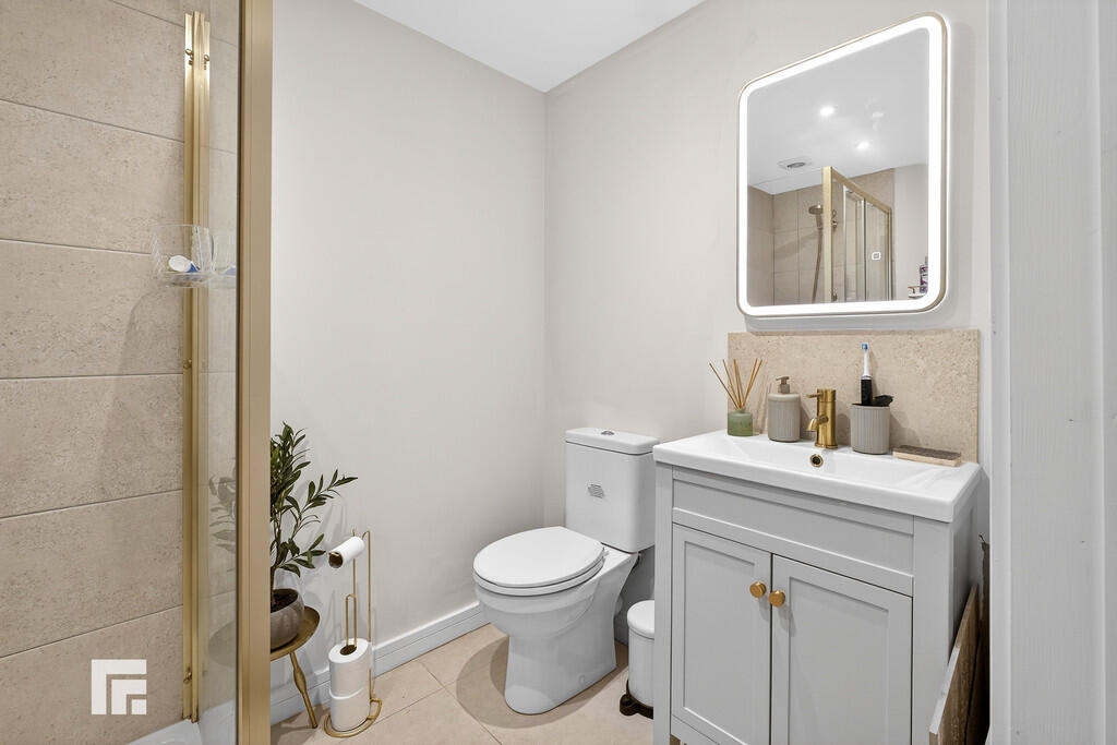 SHOWERROOM7' 11" x 5' 1" (2.43m x 1.57m) Shower cubicle with brushed gold mains shower, w.c, vanity enclosed wash hand basin with brushed gold mixer tap and storage below. Brushed gold heated towel rail. Tiled flooring.