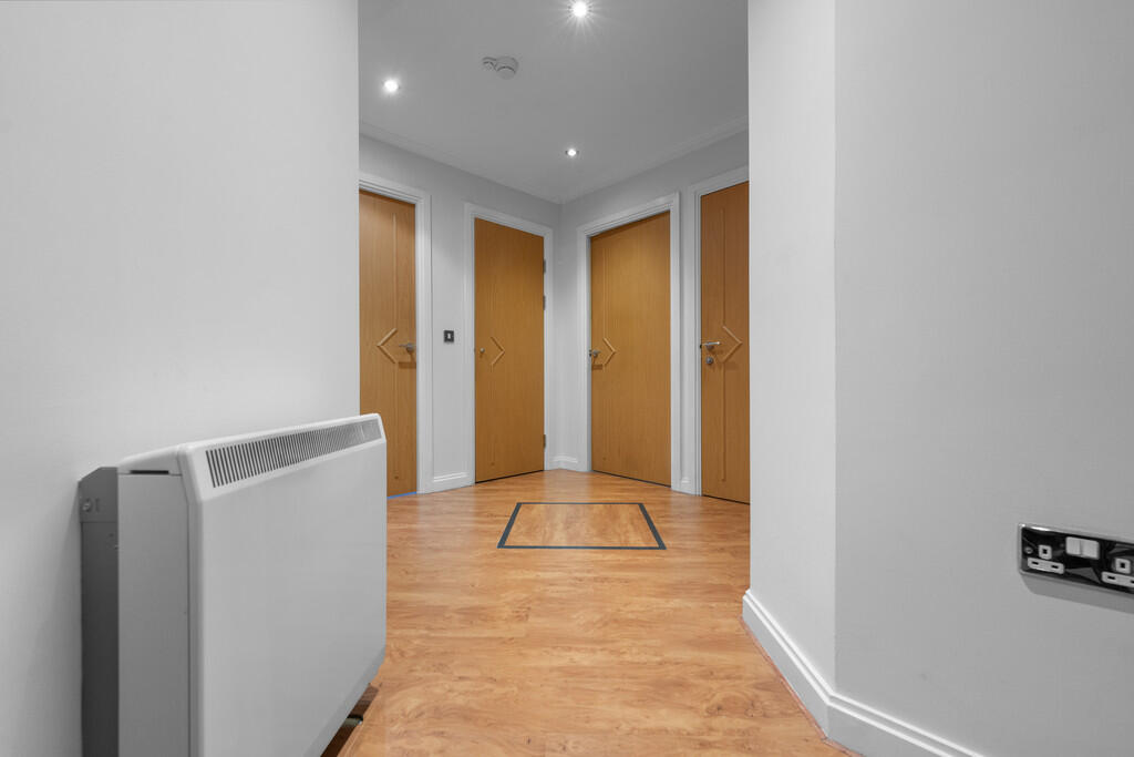 ENTRANCEHALL Entered via wooden door, with security spy hole. Spacious hallway. Laminate wood effect flooring. Wall mounted video entry intercom system. Two storage cupboards, one housing hot water tank. Wall mounted storage heater. Spotlights.