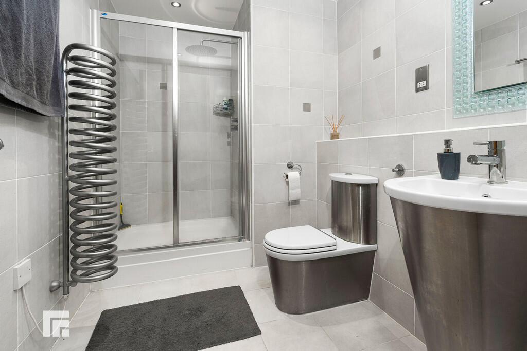 SHOWERROOM9' 6" x 6' 6" (2.90m x 1.99m) Tiled flooring. Fully tiled walls. Double shower cubicle. Pedestal wash hand basin, with mixer tap. W.C. Shaver point. Heated spiral towel rail. Extractor fan. Spotlights.