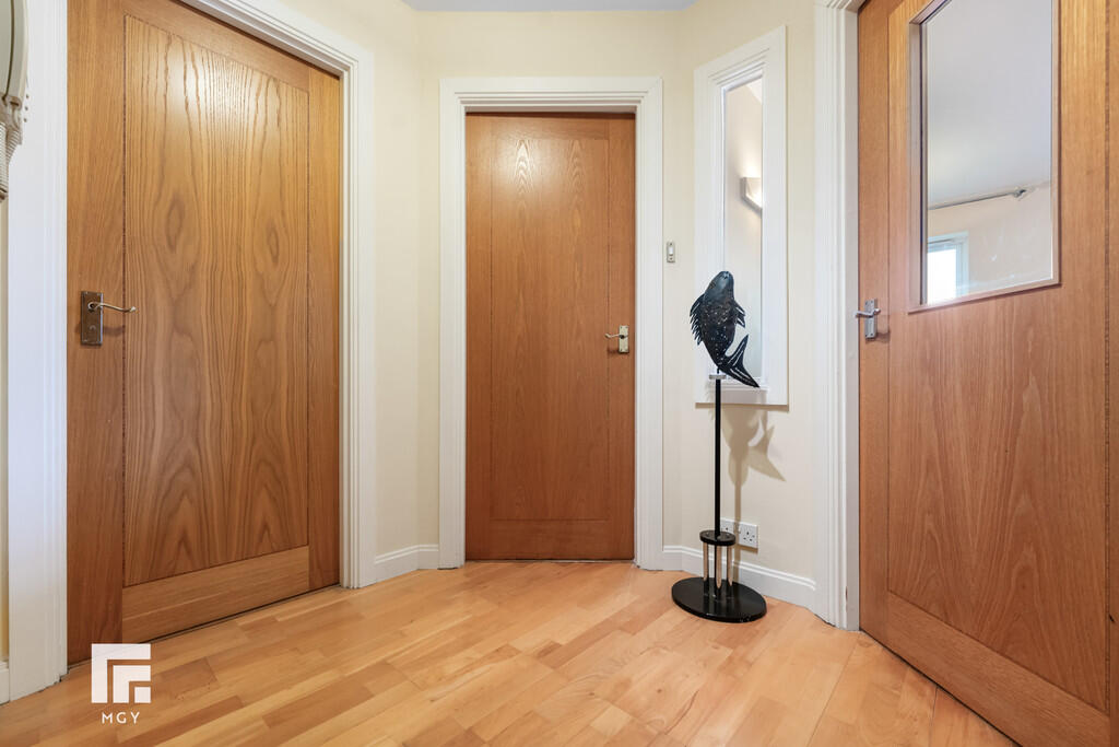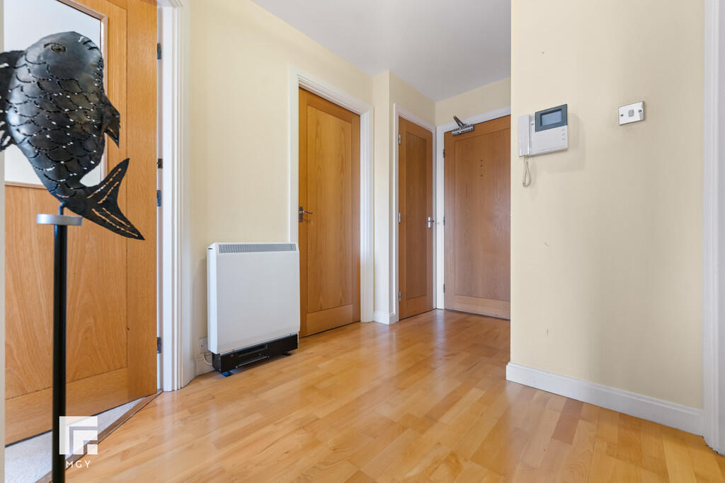 ENTRANCEHALL Entered via wooden door, with security spy hole. Spacious hallway, with video entry intercom system. Wooden laminate effect flooring. Wall mounted storage heater. Two storage cupboards, one housing hot water tank and one with plumbing for a washing machine.