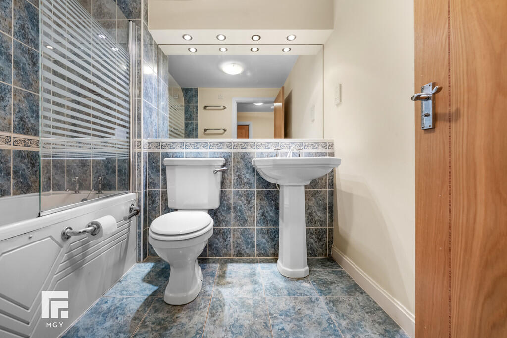 BATHROOM Tiled flooring. Part tiled walls. Panelled bath with mains shower over and glass shower screen. Pedestal wash hand basin with mixer tap over. W.C. Wall mounted vanity mirror above. Extractor fan. Shaver Point. Wall mounted storage heater.