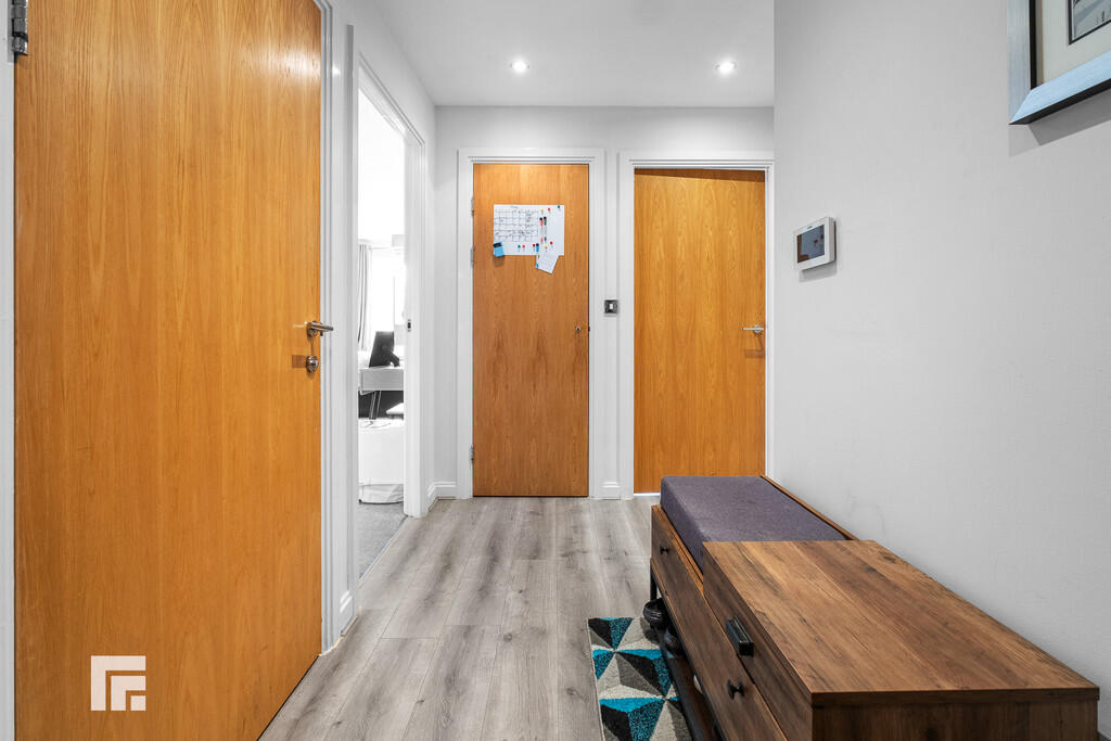 ENTRANCEHALL Entered via wooden door, with security spy hole. Laminate wood effect flooring. Underfloor heating. Wall mounted video entry intercom system. Storage cupboard, housing hot water tank. Thermostat control. Spotlights.