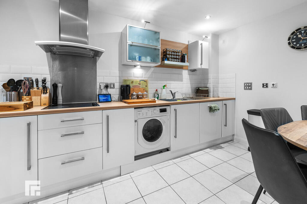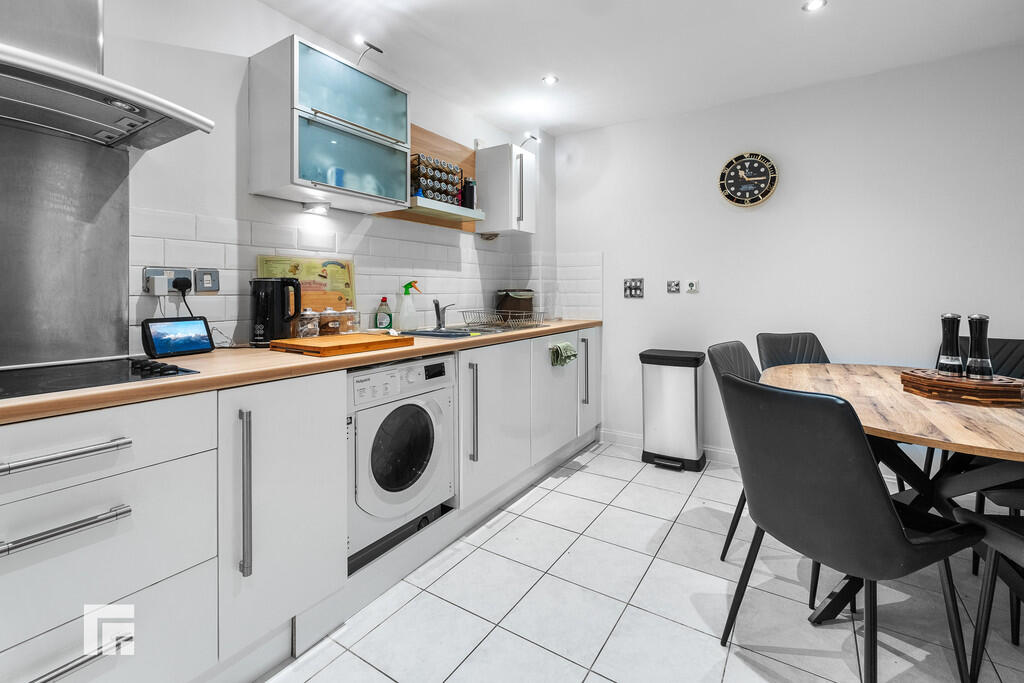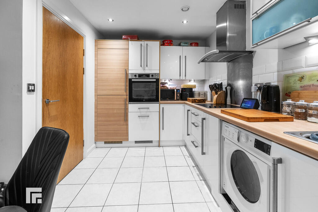 KITCHEN/DINER14' 0" x 9' 10" (4.27m x 3.01m) Separate kitchen, with space for dining table. Tiled flooring. Part tiled walls. Modern fitted wall and base units, with work surfaces incorporating stainless steel sink. Ample storage, with under unit spotlights and additional lighting over. Built in oven and four ring electric hob, with stainless steel extractor hood over. Splash back. Integrated fridge/freezer, dishwasher and brand new washer/dryer. Underfloor heating. Thermostat. Extractor fan. Spotlights.