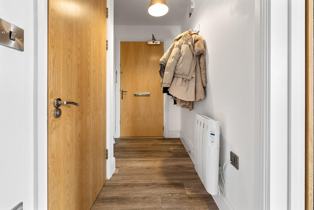ENTRANCEHALL Entered via wooden door, with security spy hole. Wood effect laminate flooring. Wall mounted electric panel heater. Large storage cupboard, housing hot water tank. Wall mounted security intercom system.