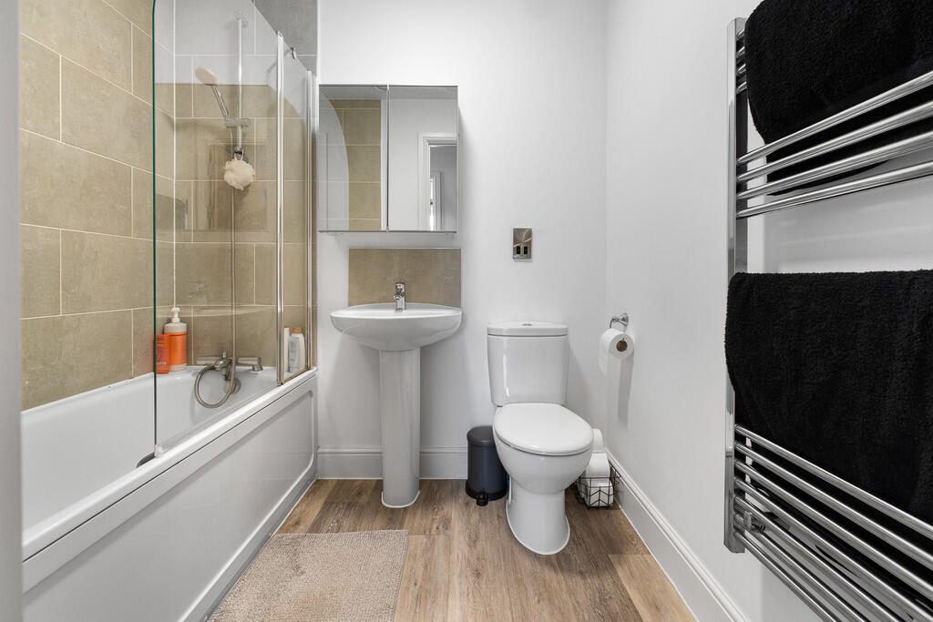 BATHROOM6' 10" x 5' 6" (2.09m x 1.70m) Wood effect laminate flooring. Part tiled walls. Panelled bath, with shower over and glass shower screen. Pedestal wash hand basin. W.C. Wall mounted mirrored vanity unit. Heated towel rail.
