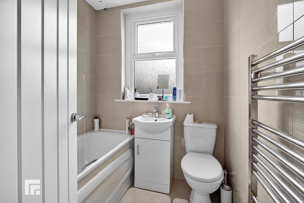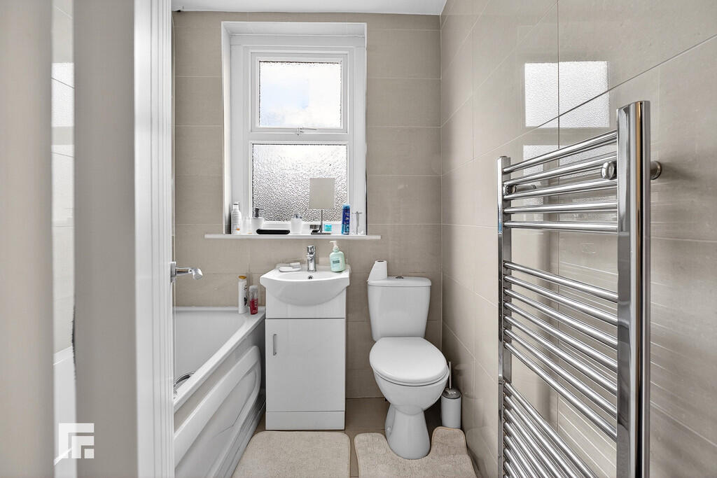 BATHROOM5' 9" x 5' 6" (1.76m x 1.70m) Obscured double glazed window to rear. Tiled walls and floor. Panelled bath with mixer tap and mains shower over, w.c, vanity enclosed wash hand basin with mixer tap and storage below. Chrome heated towel rail. Spotlights.
