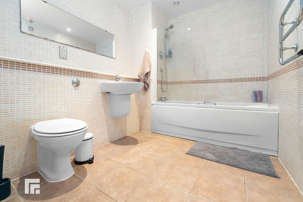 BATHROOM8' 9" x 7' 1" (2.67m x 2.17m) Spacious bathroom. Tiled flooring. Fully tiled walls. Wall mounted wash hand basin, with mixer tap. W.C. Panelled bath, with mains shower over and glass shower screen. Wall mounted mirror. Heated towel rail. Shaver point. Extractor fan. Spotlights.