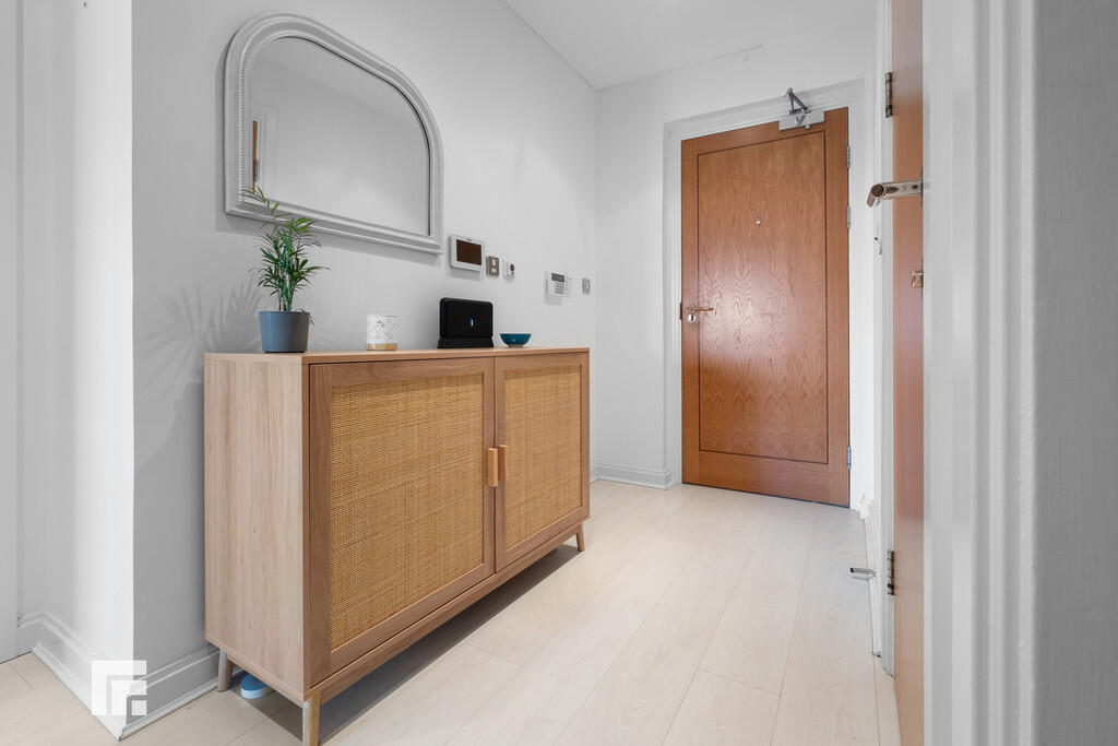 ENTRANCEHALL Entered via wooden door, with security spy hole. Laminate wood effect flooring. Underfloor heating. Wall mounted video entry intercom system. Storage cupboard, housing hot water tank. Thermostat.
