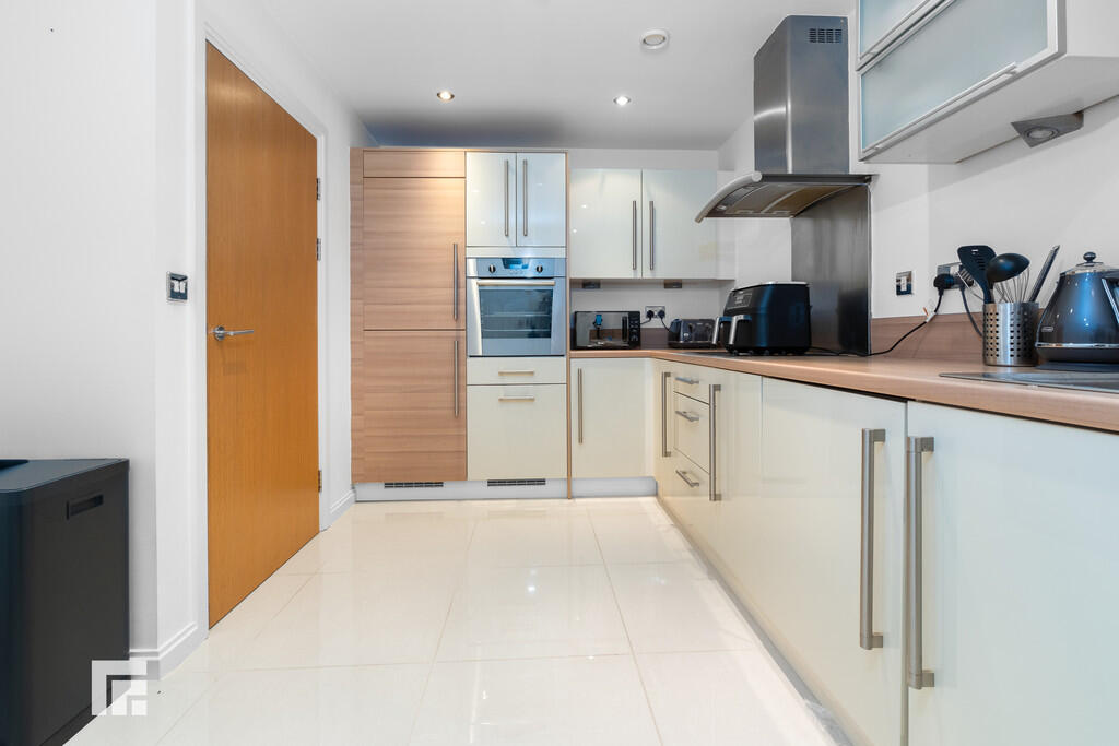 KITCHEN14' 0" x 9' 10" (4.28m x 3.00m) Separate kitchen, with space for dining table. Tiled flooring. Part tiled walls. Modern fitted wall and base units, with work surfaces incorporating stainless steel sink. Ample storage, with under unit spotlights and additional lighting over. Built in oven and four ring electric hob, with stainless steel extractor hood over. Splash back. Integrated fridge/freezer, dishwasher and brand new washer/dryer. Underfloor heating. Thermostat. Extractor fan. Spotlights.