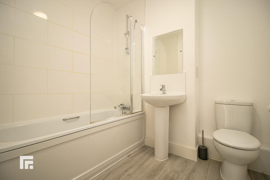 BATHROOM Modern bathroom. Laminate wood effect flooring. Part tiled walls. Panelled bath, with shower over and glass shower screen. Pedestal wash hand basin. W.C. Wall mounted mirror. Shaver point. Heated towel rail.