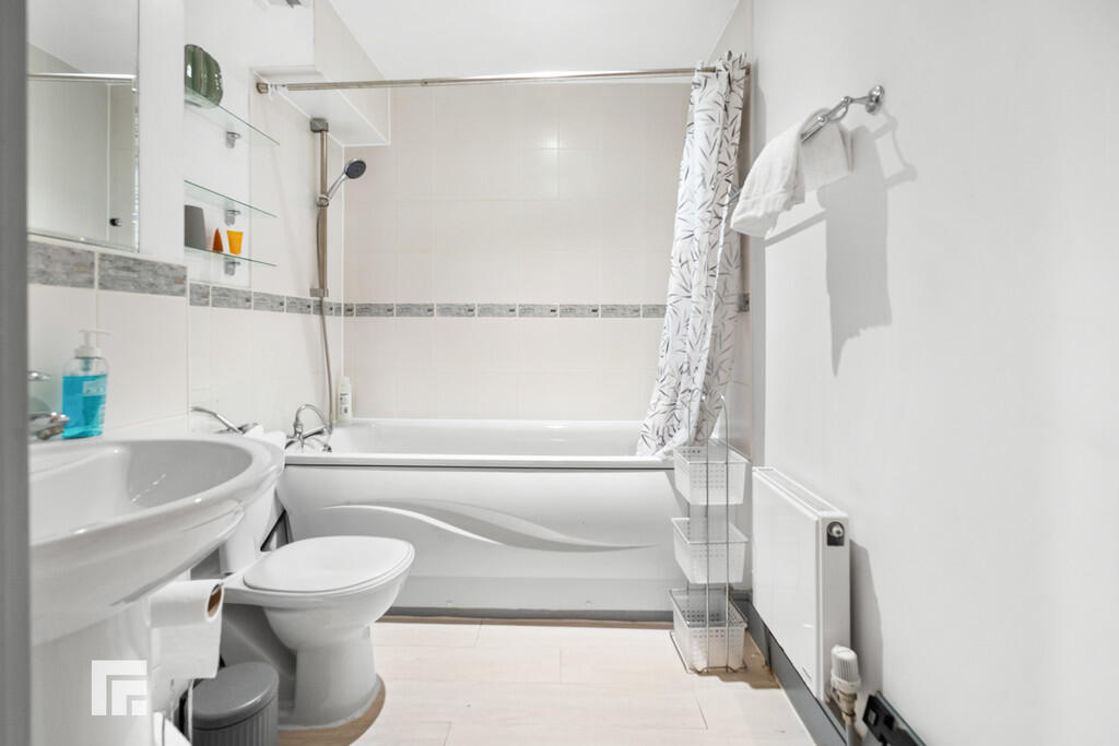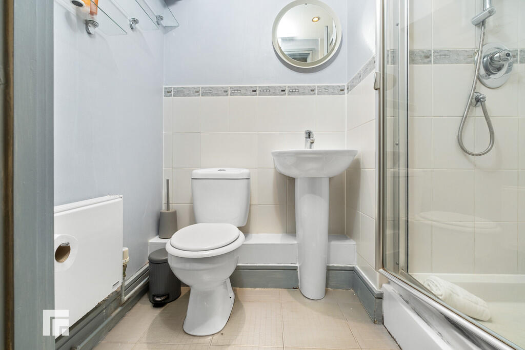 EN-SUITE Modern en-suite with shower cubicle and mains shower over. Pedestal wash hand basin with mixer tap over. WC. Part tiled walls. Vinyl flooring. Radiator. Spotlights.