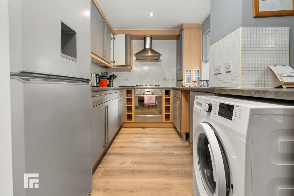 KITCHEN9' 10" x 7' 2" (3.01m x 2.20m) Range of wall, base and drawer units with worktops over across three walls, incorporating 1.5 sink and drainer with mixer tap over and four ring gas hob with integrated oven beneath and extractor hood over. Tiled flooring and part tiled walls. Space for appliances such as fridge/freezer, and washing machine. Wall mounted combi boiler. Double glazed uPVC window to front aspect. Pendant lighting. PowerPoints.