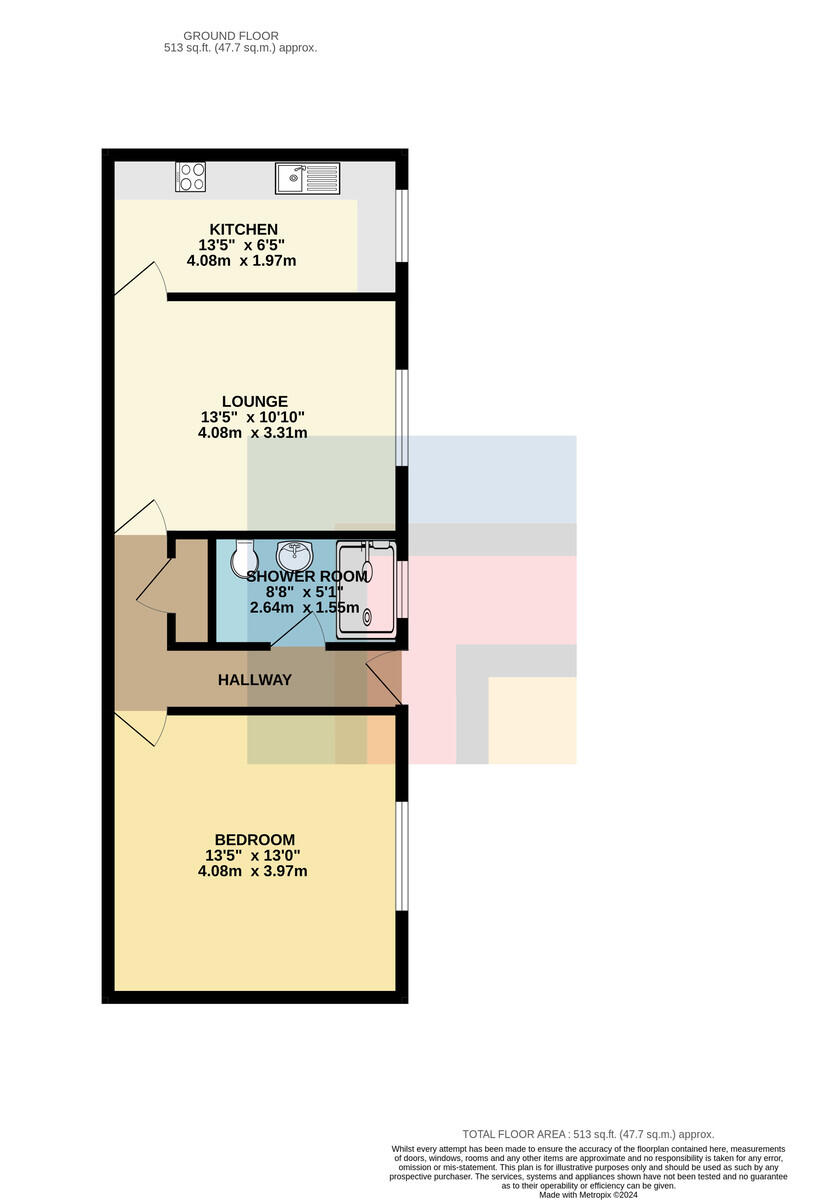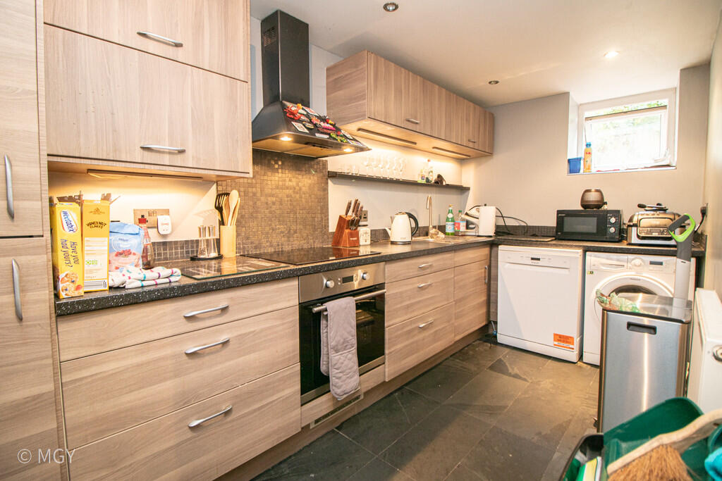 KITCHEN13' 4" x 6' 5" (4.08m x 1.97m) Double glazed uPVC windows to front. Separate kitchen. Tiled flooring. Modern fitted wall and base units, with work surfaces incorporating stainless steel sink. Ample storage, with under unit lighting. Built in oven and four ring electric induction hob, with stainless steel extractor hood over. Tiled splash back. Integrated fridge/freezer. Space for dishwasher and washing machine. Extractor fan. Spotlights. Wall mounted radiator.