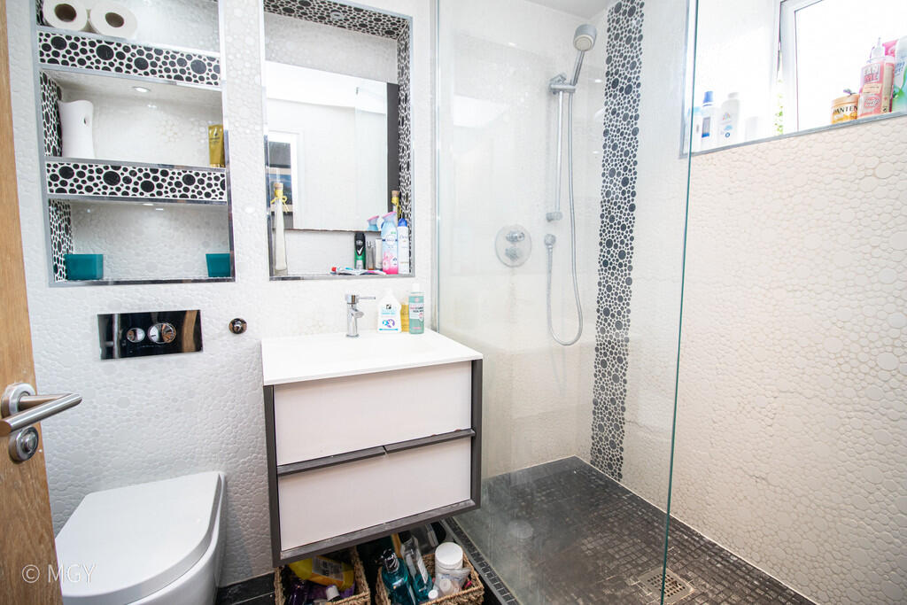 BATHROOM8' 7" x 5' 1" (2.64m x 1.55m) New double glazed uPVC windows to front. Tiled flooring. Tiled walls. Vanity enclosed wash hand basin, with mixer tap. W.C. Double shower. Inset storage with spotlights. Heated towel rail. Extractor fan. Spotlights.