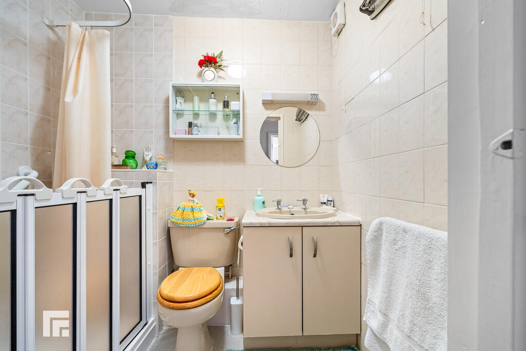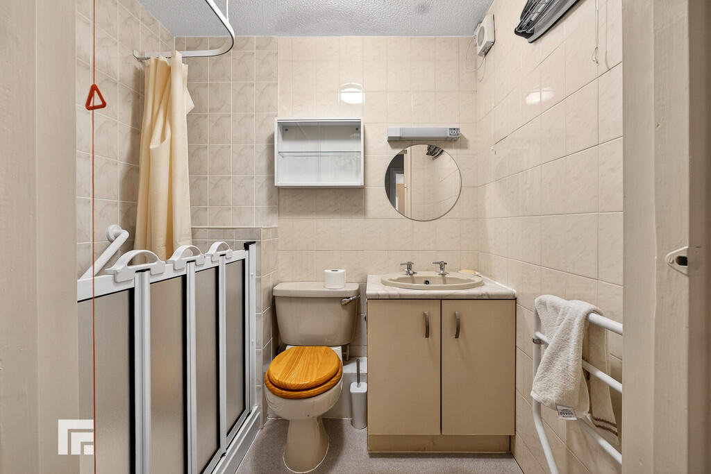BATHROOM6' 3" x 4' 9" (1.92m x 1.46m) Cream suite; low level WC, wash hand basin with twin taps and vanity, adapted step in shower with electric shower. Wall light and shaving point. Extractor fan. Heated towel rail.