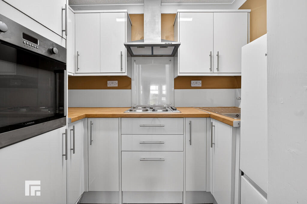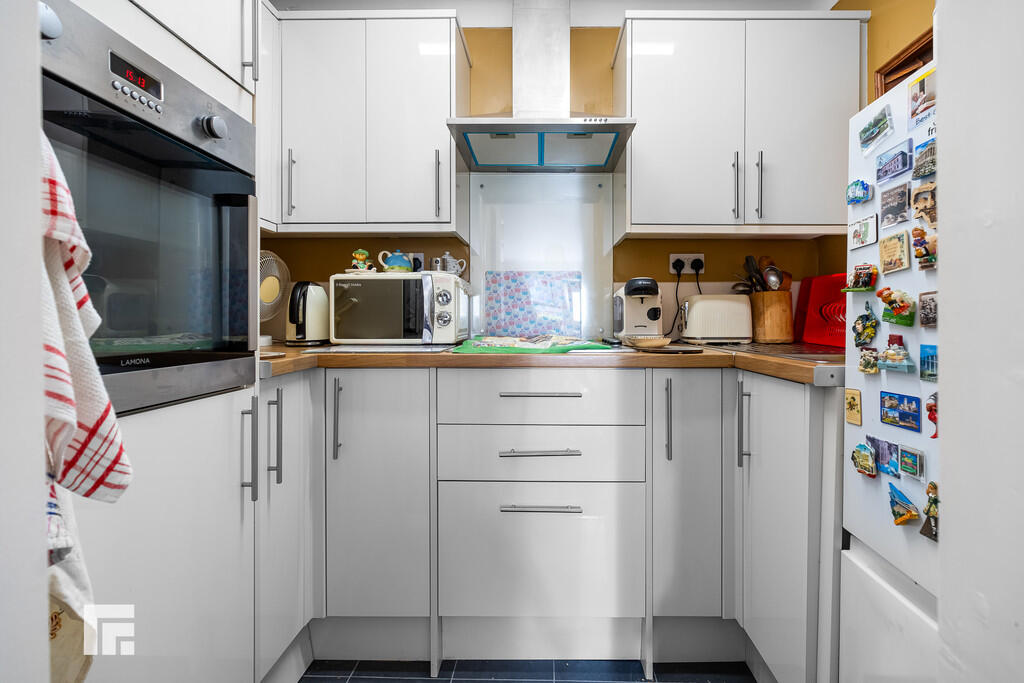 KITCHEN7' 9" x 4' 11" (2.38m x 1.50m) Appointed along three sides, modern cream high gloss eye and low level cupboards beneath laminate worktops, stainless steel sink with chrome mixer tap and drainer, integrated oven, four ring ceramic hob with extractor hood, space for fridge freezer and tiled flooring.