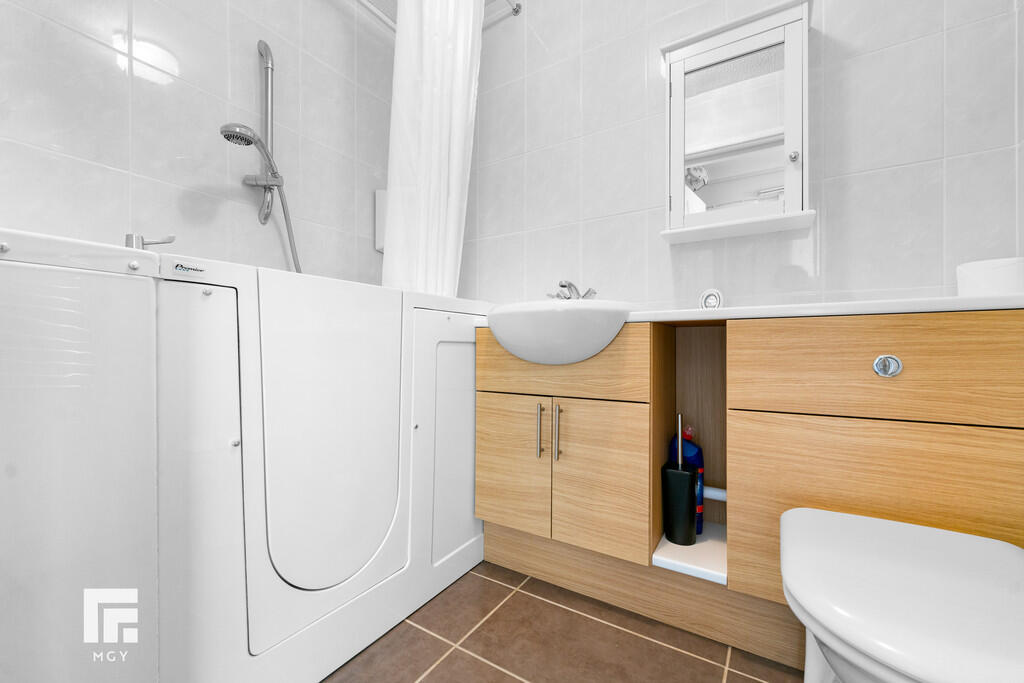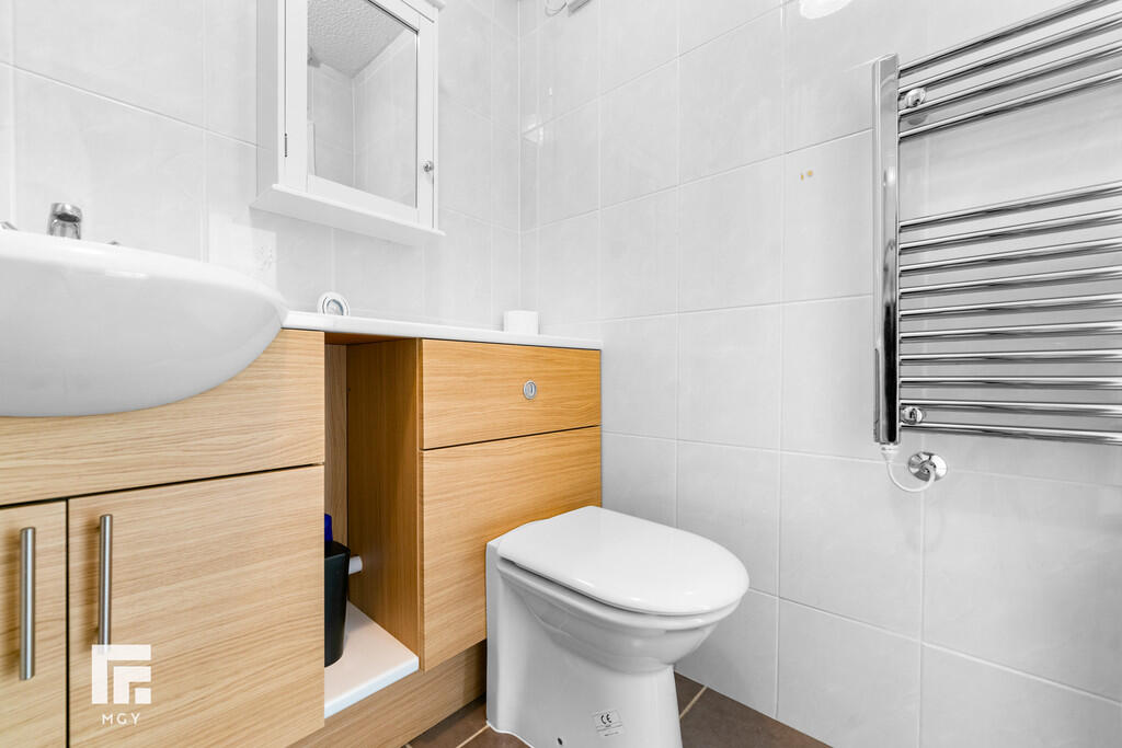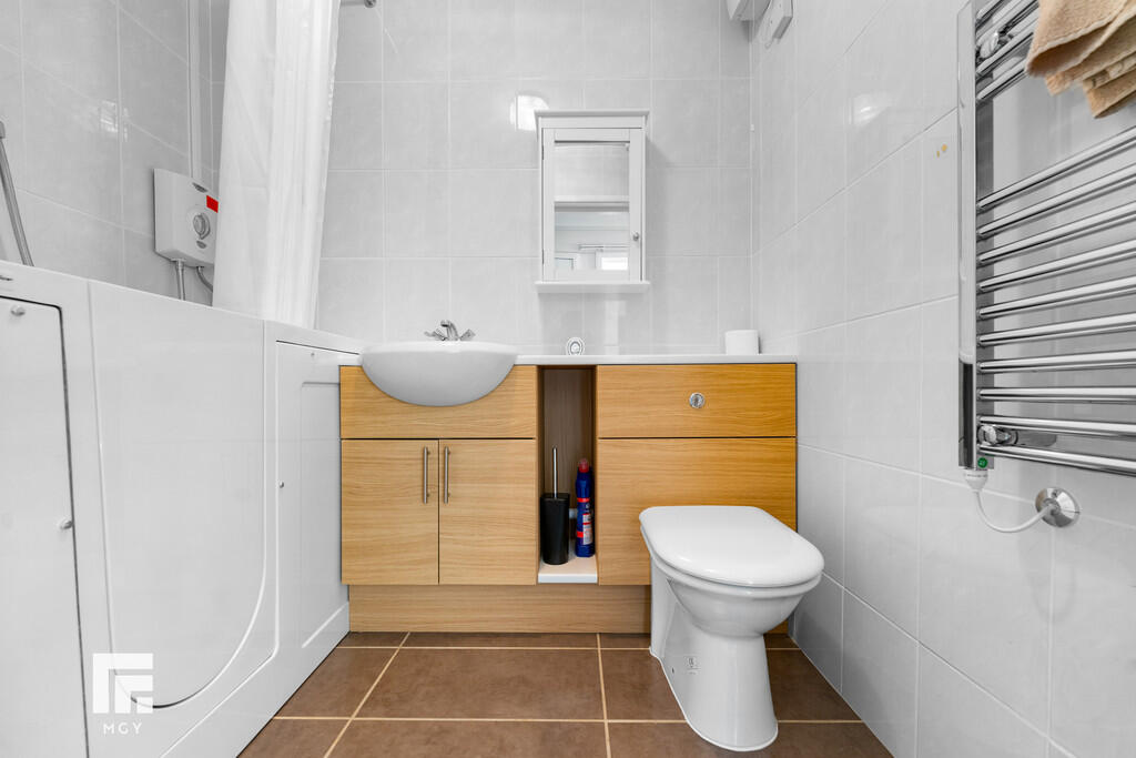 BATHROOM6' 8" x 4' 9" (2.04m x 1.47m) Vanity enclosed wash hand basin, low level WC and disability assisted bath with electric shower over. Electric towel rail. Tiled walls and flooring. Extractor fan.