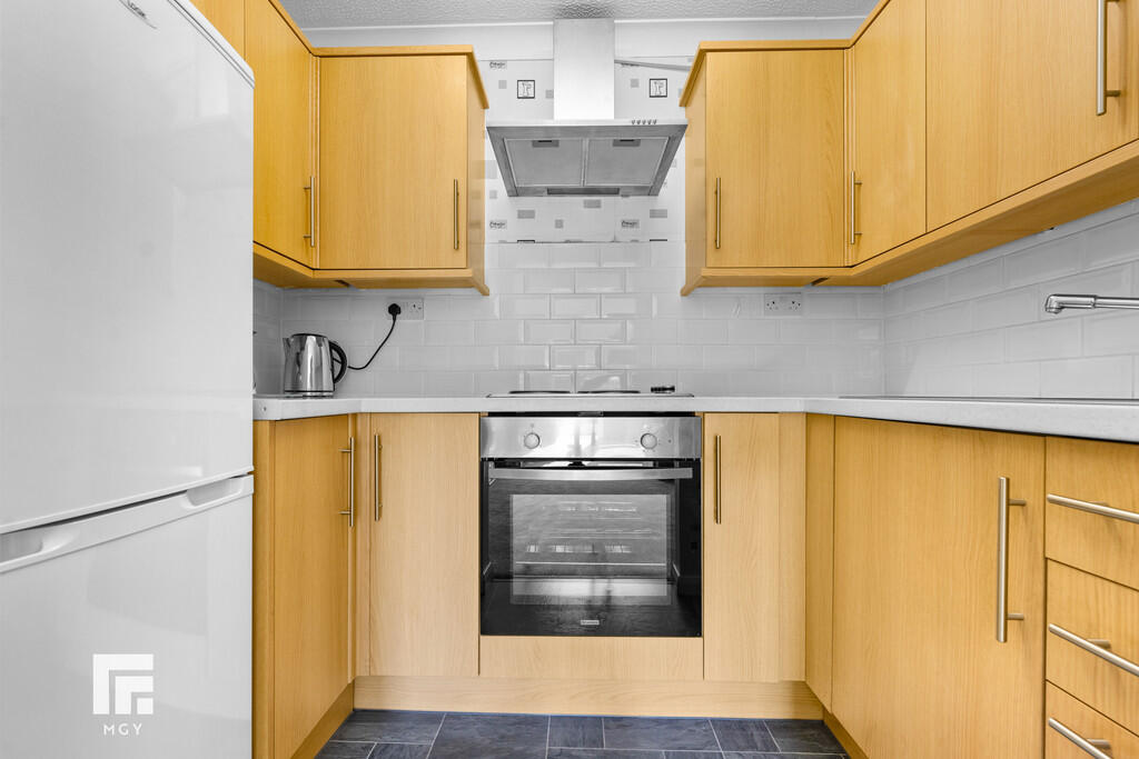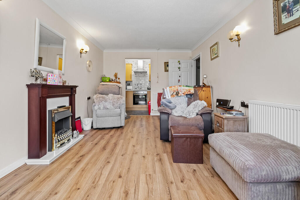 LOUNGE/DINER17' 10" x 10' 2" (5.46m x 3.11m) uPVC double glazed window and door to South Facing rear patio and communal garden. Two radiators. Feature electric fireplace. New quality laminate flooring. Opening to kitchen.