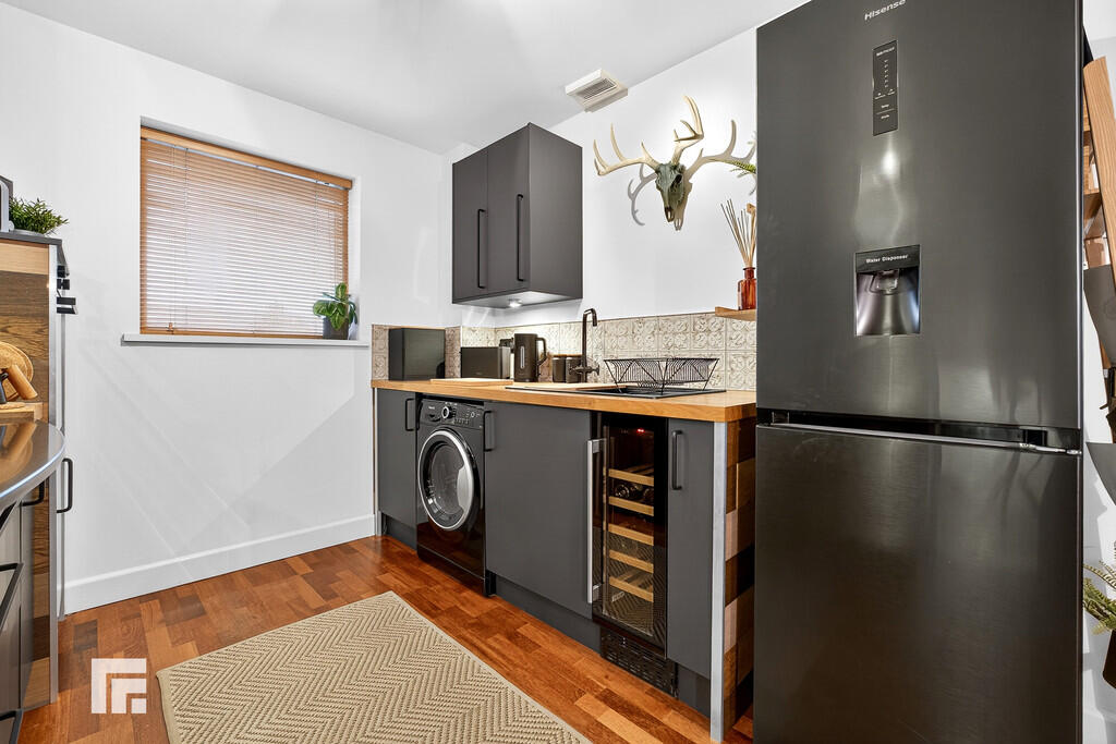 KITCHEN9' 10" x 8' 9" (3.02m x 2.69m) Double glazed window to rear. Wood flooring. Modern fitted kitchen with a range of wall, base and drawer units with worktops over incorporating composite sink and drainer with mixer tap over and four ring electric hob with extractor above. Ample storage. Integrated wine cooler and oven. Space for fridge freezer and washing machine. Tiled splashbacks. Plinth heater. Extractor fan.