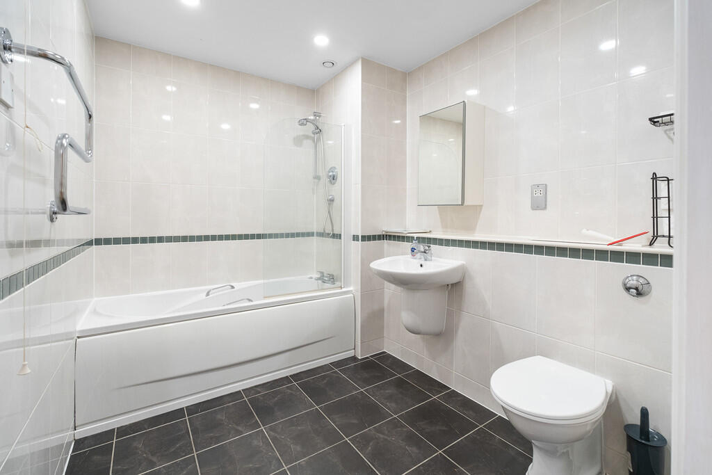BATHROOM8' 9" x 7' 2" (2.69m x 2.20m) Modern bathroom. Tiled flooring. Fully tiled walls. Wall mounted wash hand basin, with mixer tap. W.C. Panelled bath, with mains shower over and glass shower screen. Heated towel rail. Shaver point. Extractor fan. Spotlights.