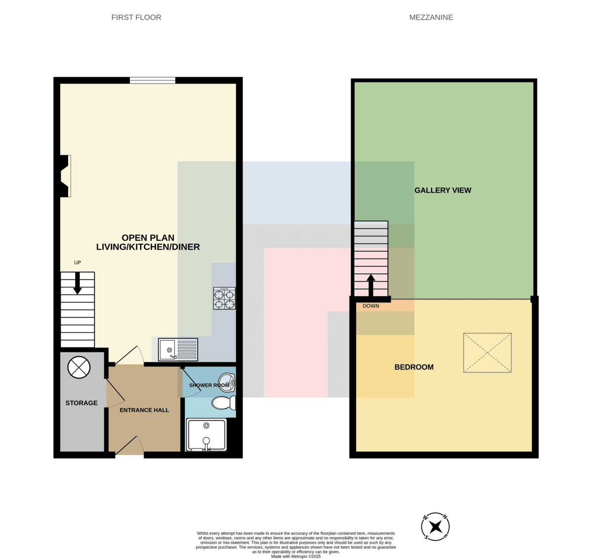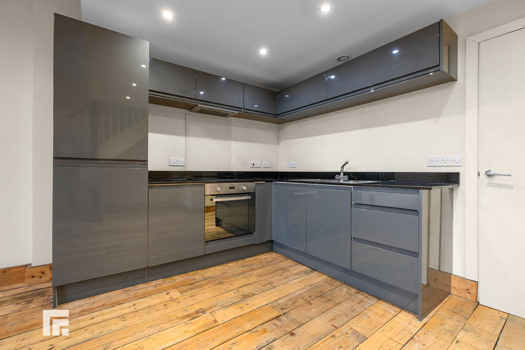 OPENPLANLOUNGE/KITCHEN24' 8" x 15' 10" (7.52m x 4.83m) Bright open plan space. Exposed floorboards. Exposed brick wall with floor to ceiling window to rear aspect. Electric heater. Pendant lighting. Power points. Range of wall, base and drawer units to kitchen with worktops over incorporating stainless steel sink with drainer and mixer tap above, electric hob with oven beneath and extractor over. Integrated fridge/freezer. Spotlights. Stairs leading to mezzanine bedroom.