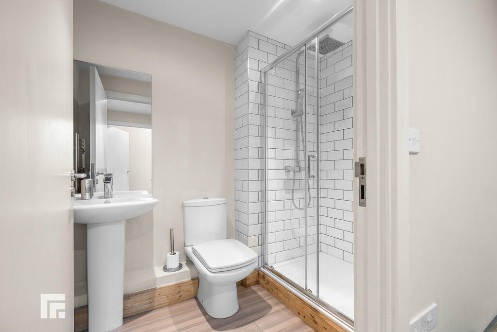 BATHROOM7' 10" x 4' 11" (2.40m x 1.50m) Laminate flooring. Partially tiled walls. Walk in shower cubicle with mains powered shower over. WC. Pedestal wash hand basin with mixer tap over. Spotlights.