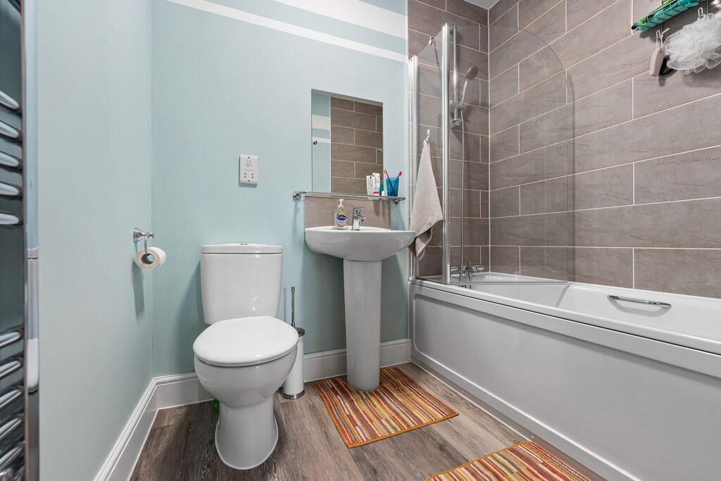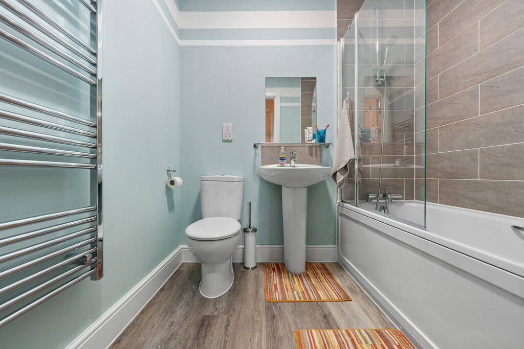 BATHROOM6' 9" x 5' 6" (2.07m x 1.70m) Laminate wood effect flooring. Part tiled walls. Panelled bath, with shower over and glass shower screen. Pedestal wash hand basin. W.C. Wall mounted mirror. Shaver point. Heated towel rail.