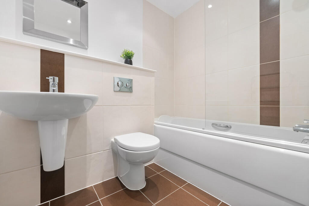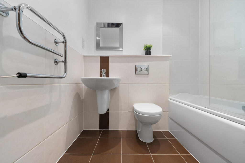 BATHROOM6' 10" x 5' 6" (2.09m x 1.70m) Tiled flooring. Part tiled walls. Panelled bath, with shower over and glass shower screen. Wall mounted wash hand basin. Heated towel rail. Shaver point. Spotlights.