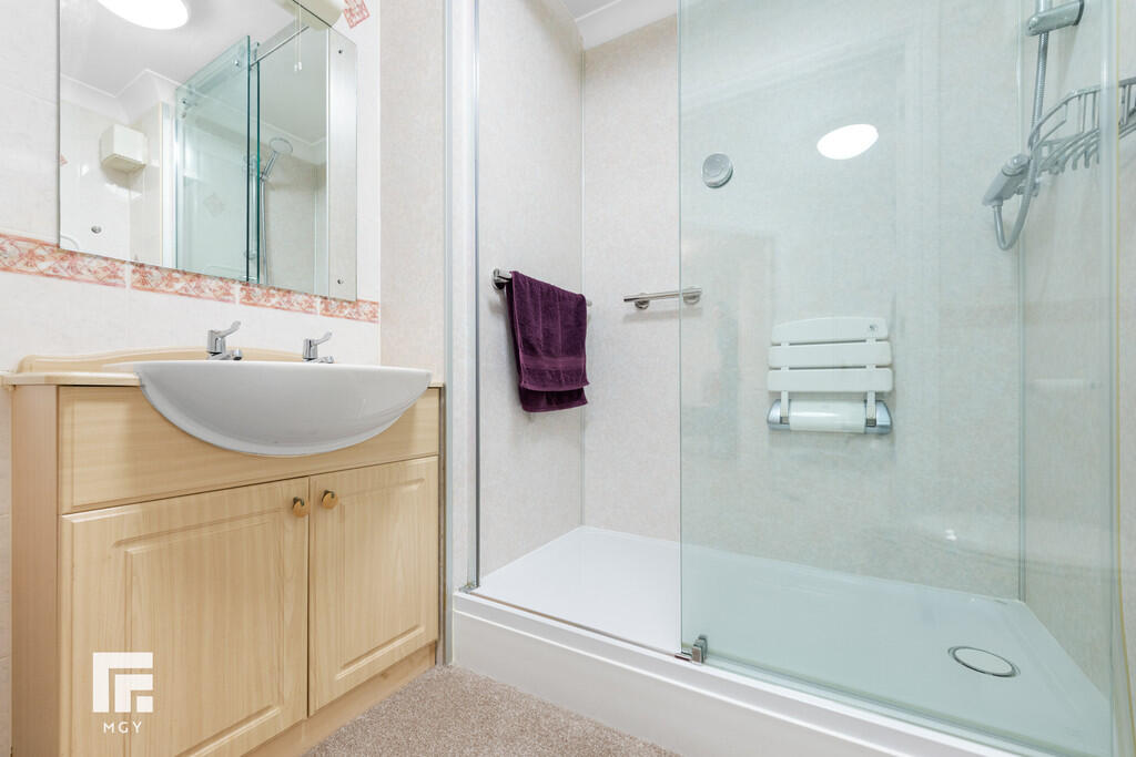 SHOWERROOM6' 8" x 5' 5" (2.05m x 1.67m) Off white suite; low level WC, wash hand basin with built in vanity with dual chrome taps, wall mirror and light, double step in shower cubicle with chrome shower, flip down seat, glass sliding shower screen, half tiled walls and wall panelling. Dimpled wall heater, heated towel rail, extractor fan.