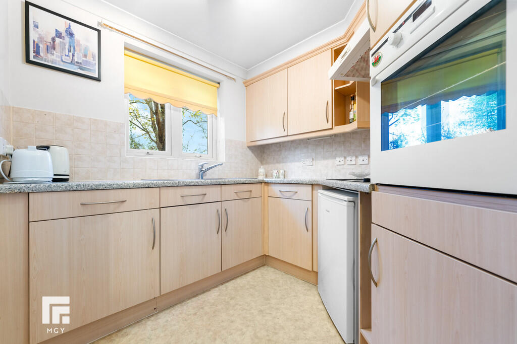 KITCHEN7' 6" x 7' 0" (2.30m x 2.15m) Appointed along three sides, eye and low level cupboards beneath laminate worktops, stainless steel 1.5 bowl sink with chrome mixer tap, four ring 'AEG' electric hob, extractor hood, integrated high level single oven/grill, integrated fridge, space for freezer. Dimplex wall heater. Tiled splashbacks. uPVC window overlooking well maintained communal garden. Double doors into lounge.