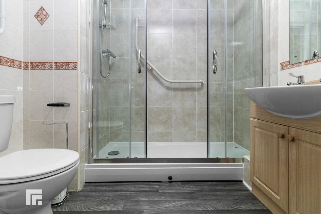SHOWERROOM7' 0" x 5' 6" (2.14m x 1.69m) Double shower cubicle, low level WC and vanity unit with wash hand basin and cupboard below. Fitted mirror, light and shaver point. Heated towel rail. Extractor fan. Fully tiled walls. New vinyl flooring.