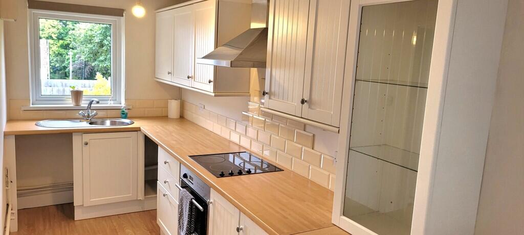 Kitchen Roomsize: 11'8 x 5'9 Double glazed window to front. Fitted Kitchen to comprise range of base and wall units with rolled edge laminated work surfaces incorporating inset stainless steel sink and drainer with chrome mixer taps over. Built in four burner electric hob and oven with stainless steel extractor canopy over. Space for fridge and recess and plumbing for two appliances.