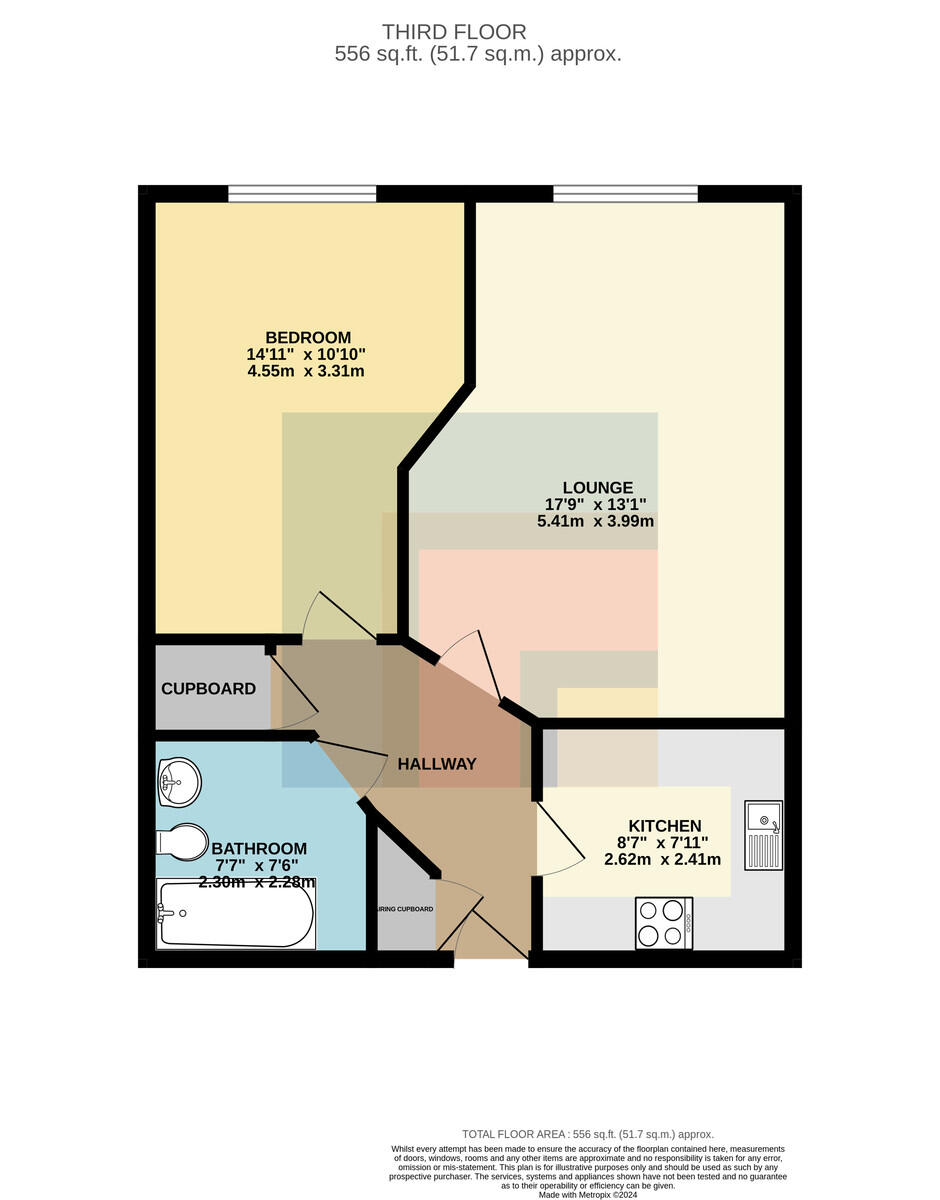 SEPERATEKITCHEN8' 7" x 7' 10" (2.62m x 2.41m) Fitted kitchen with tiled splashbacks. Tiled flooring. Wall and base units, with round edged work surfaces incorporating one and a half stainless steel sink, with hot and cold tap. Built in oven and four ring electric hob, with stainless steel extractor hood over. Ample storage. Built in fridge freezer and washing machine.