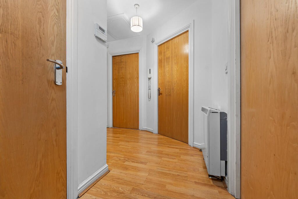 ENTRANCEHALL Entered via wooden door with security spy hole. Laminate wood effect flooring. Wall mounted security entry intercom system. Two storage cupboards, one housing hot water tank. Thermostat. Wall mounted electric storage heater.