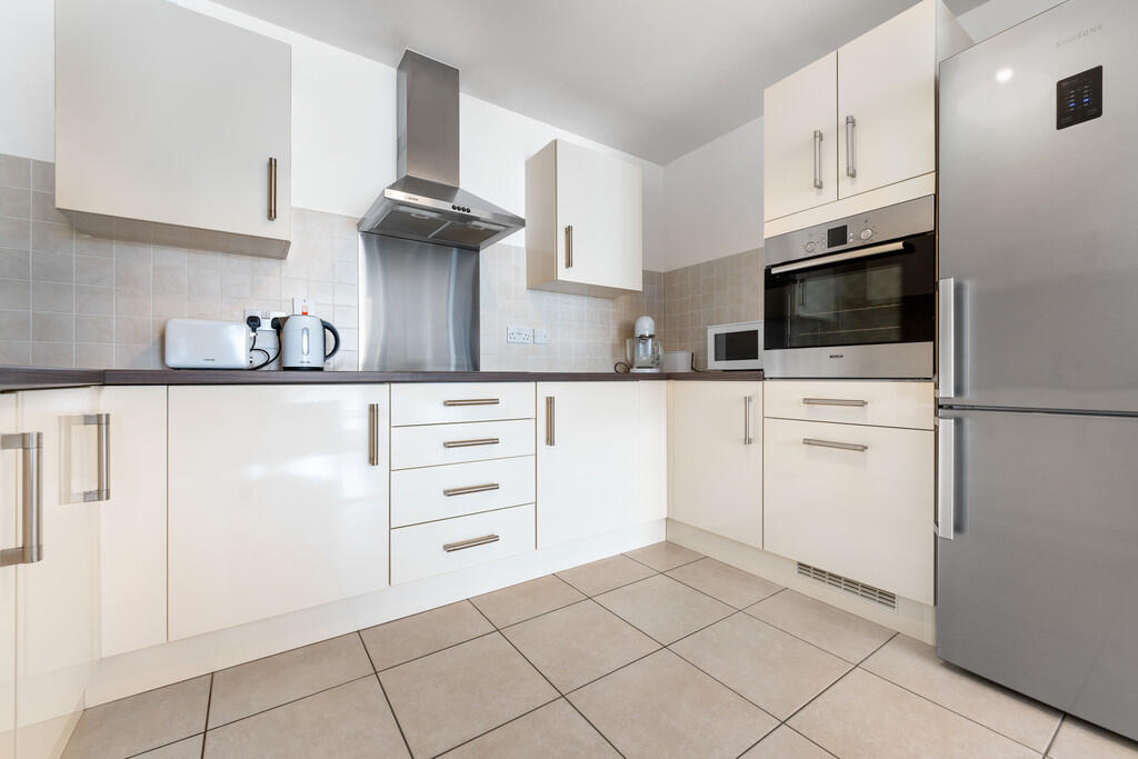 KITCHEN10' 11" x 7' 9" (3.34m x 2.38m) Large modern kitchen. Tiled flooring. Part tiled walls. Fitted units, with work surfaces incorporating stainless steel sink. Ample storage, with over unit lighting. Integrated oven, four ring electric hob and stainless steel extractor hood over. Splash back. Extractor fan. Integrated washer/dryer. Space for fridge freezer.