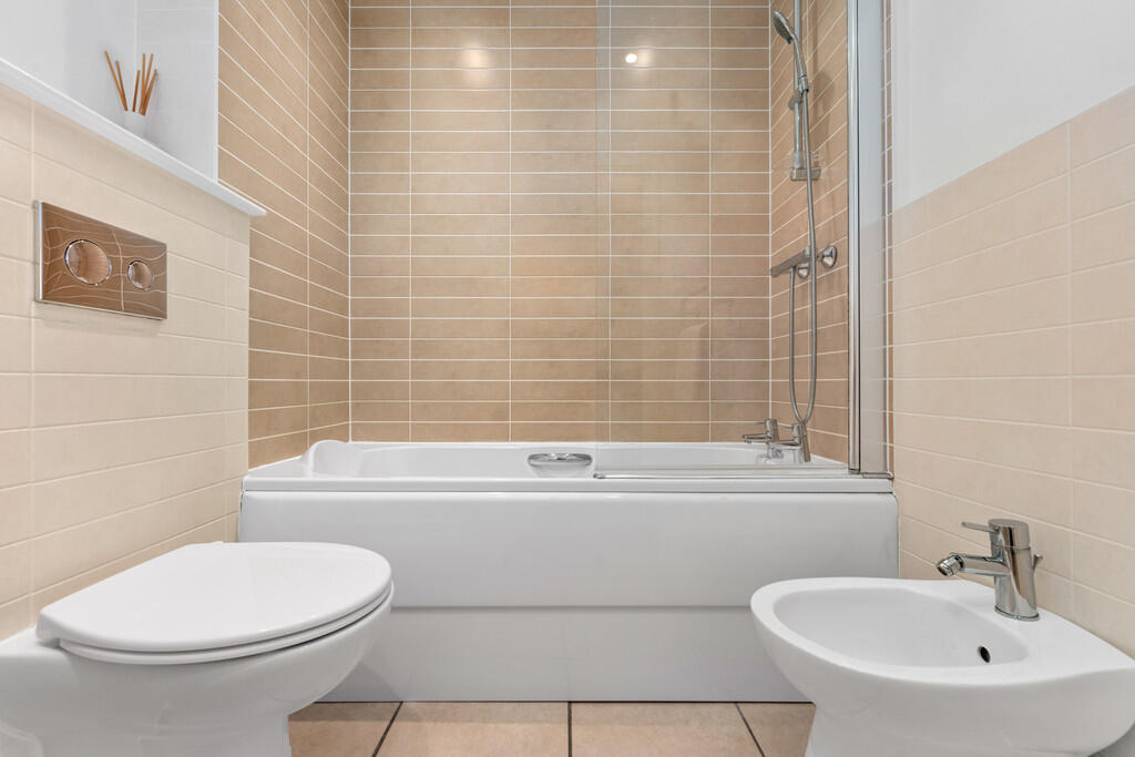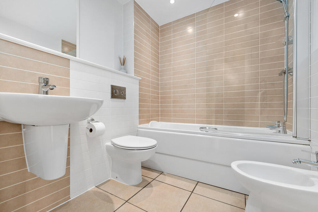 BATHROOM6' 10" x 6' 2" (2.09m x 1.89m) Tiled flooring. Part tiled walls. Panelled bath, with shower over and glass shower screen. Wall mounted wash hand basin. Bidet. Heated towel rail. Shaver point. Spotlights.