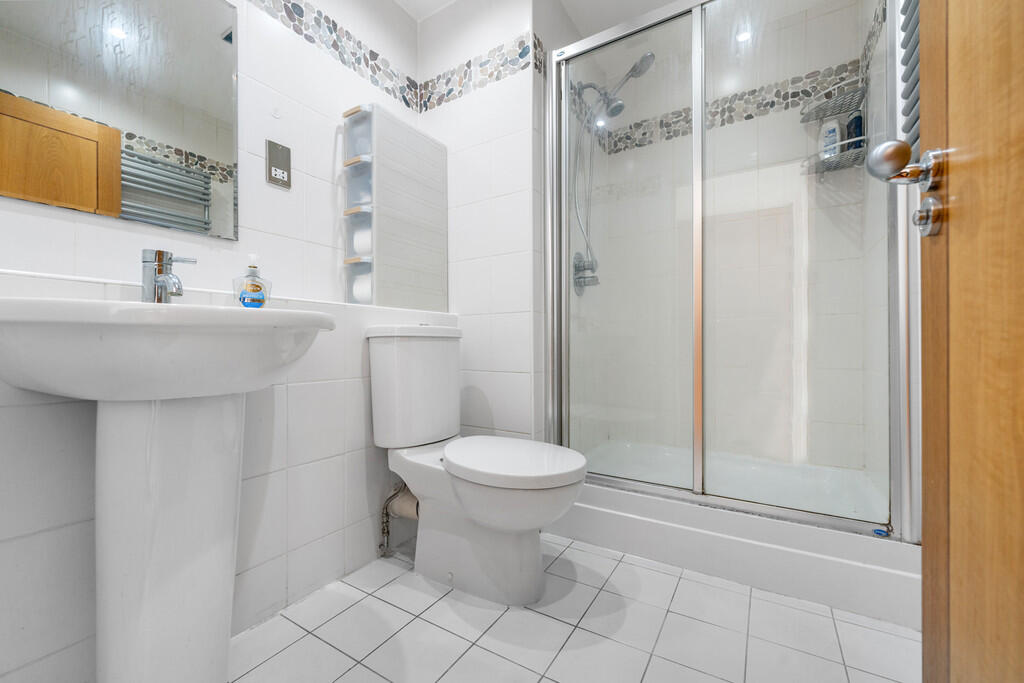 ENSUITE8' 2" x 5' 10" (2.5m x 1.8m) En-suite shower room. Fully tiled walls and flooring. Spotlights. Walk in shower cubicle with mains powered shower over. WC. Pedestal wash hand basin with mixer tap over. Shaver point. Extractor fan. Chrome heated towel rail.