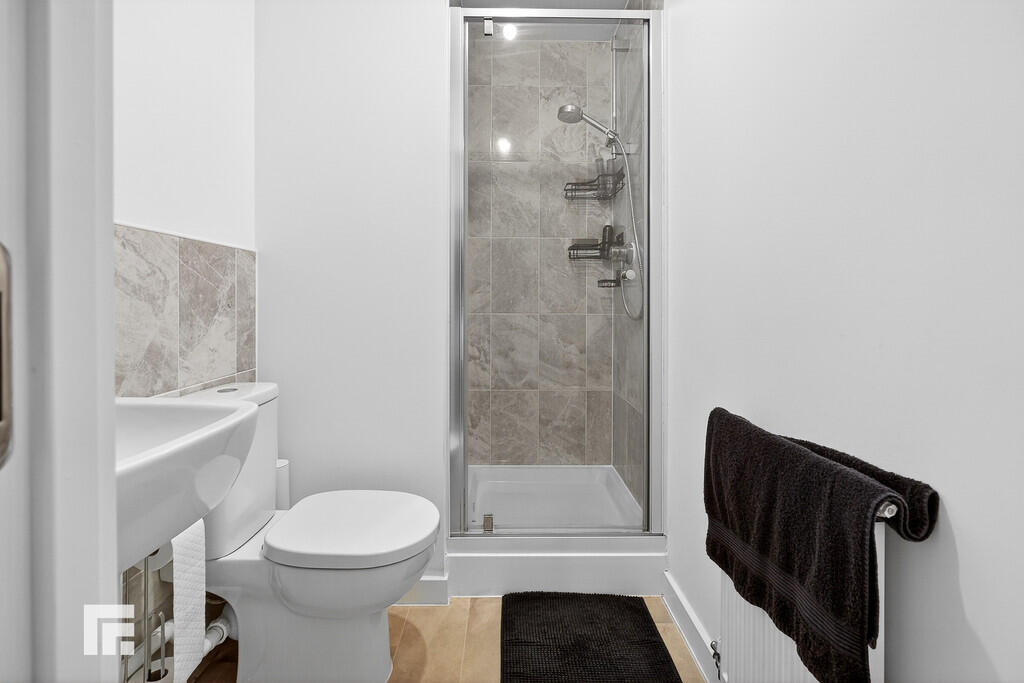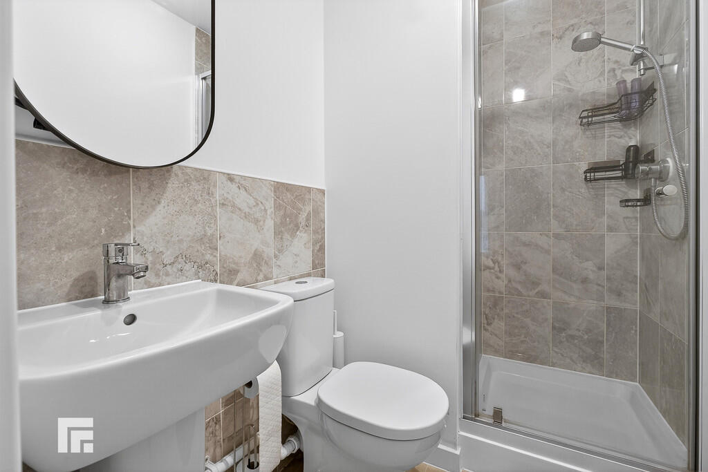 ENSUITE Quality white suite comprising low level wc, wash hand basin, shower cubicle with chrome shower. Tiled splash back. Extractor fan. Radiator.