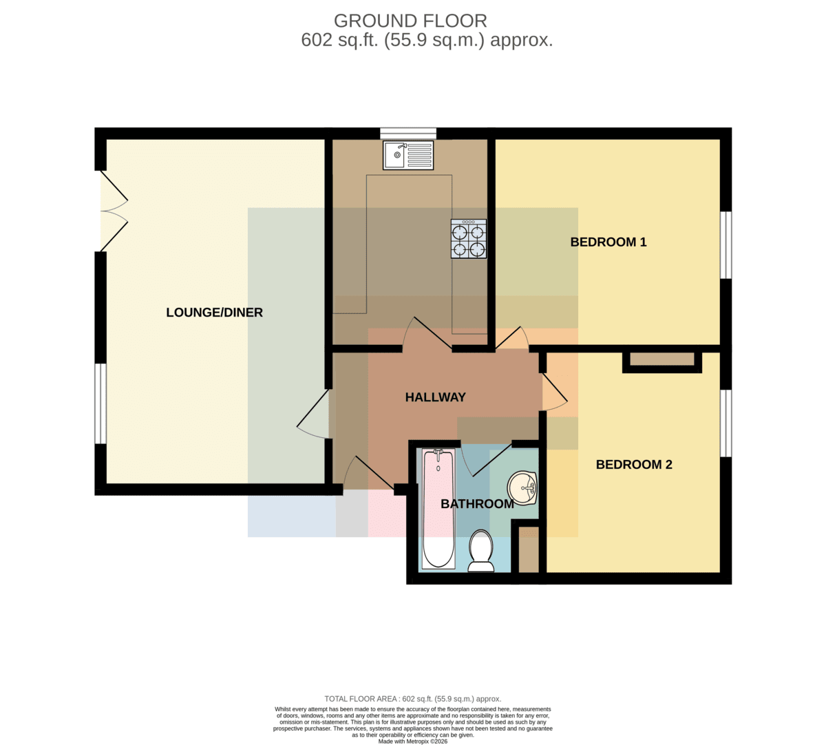 KITCHEN8' 0" x 10' 6" (2.44m x 3.2m) Fitted Kitchen to comprise a range of base and wall units with rolled edge laminated work surfaces incorporating sink and drainer with mixer taps over. Four burner electric hob and oven with extractor over. Recess and plumbing for an appliance and space for fridge/freezer. Double glazed opaque window to the side. Ceramic tile to splash back areas. Vinyl flooring.