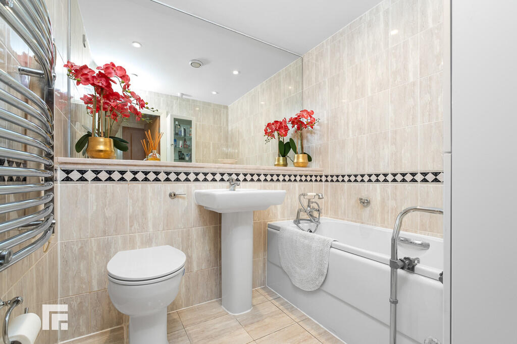 BATHROOM6' 10" x 5' 10" (2.1m x 1.8m) Tiled flooring and walls. WC. Pedestal wash hand basin with mixer tap over. Panelled bath with hot and cold tap over and shower head attachment. Spotlights. Extractor fan.