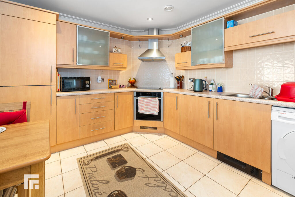 KITCHEN12' 5" x 11' 1" (3.8m x 3.4m) Continuation of the tiled flooring from hallway. Fitted kitchen with a range of wall, base and drawer units with worktops over incorporating electric hob with extractor above and oven beneath, and stainless steel 1.5 sink with mixer tap over. Tiled splashbacks. Integrated fridge/freezer. Space for washing machine and tumble dryer. Spotlights. Power points. Obscure glass wall to create privacy between the living room/kitchen.