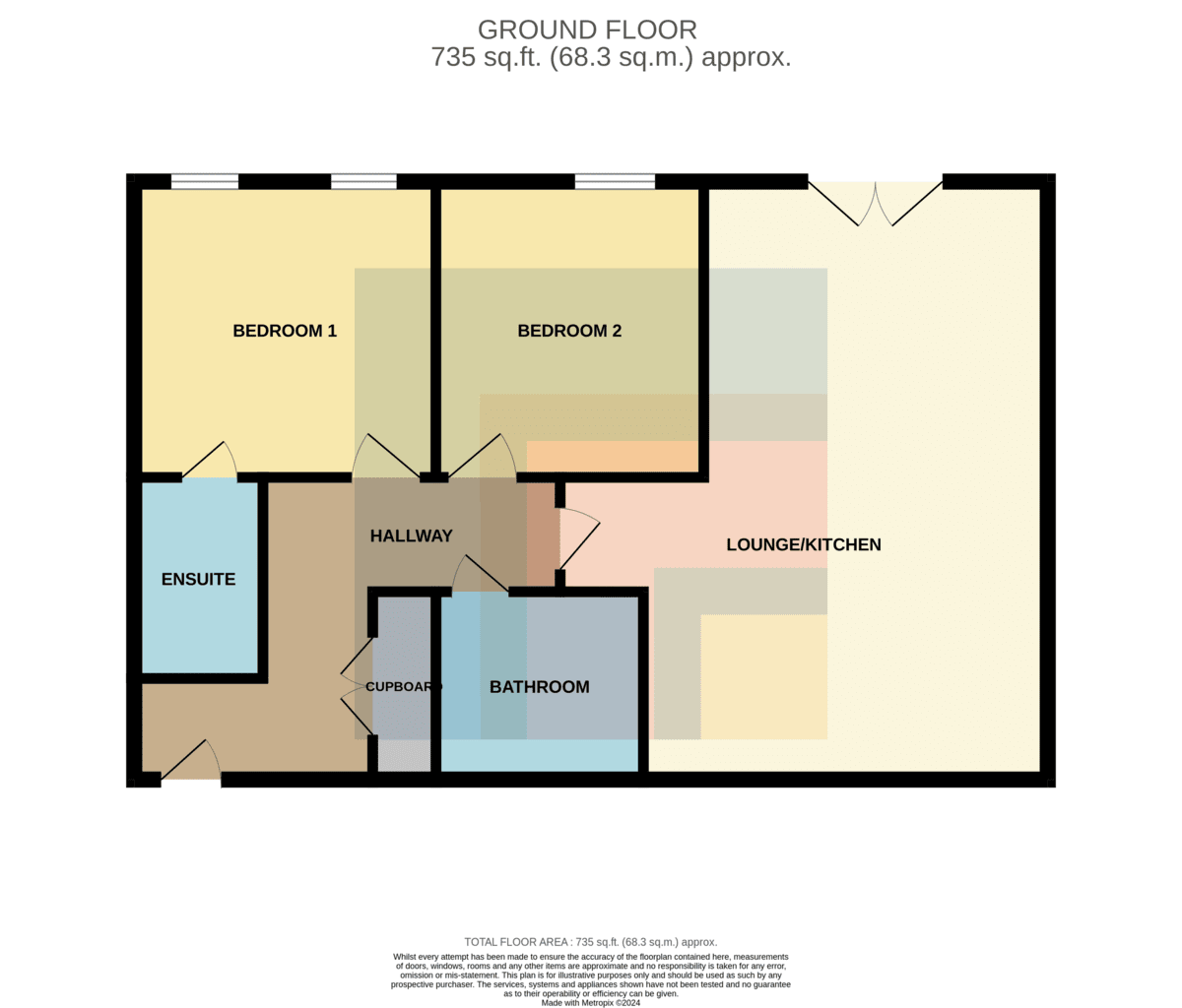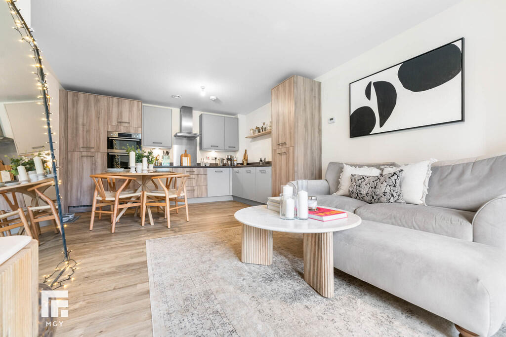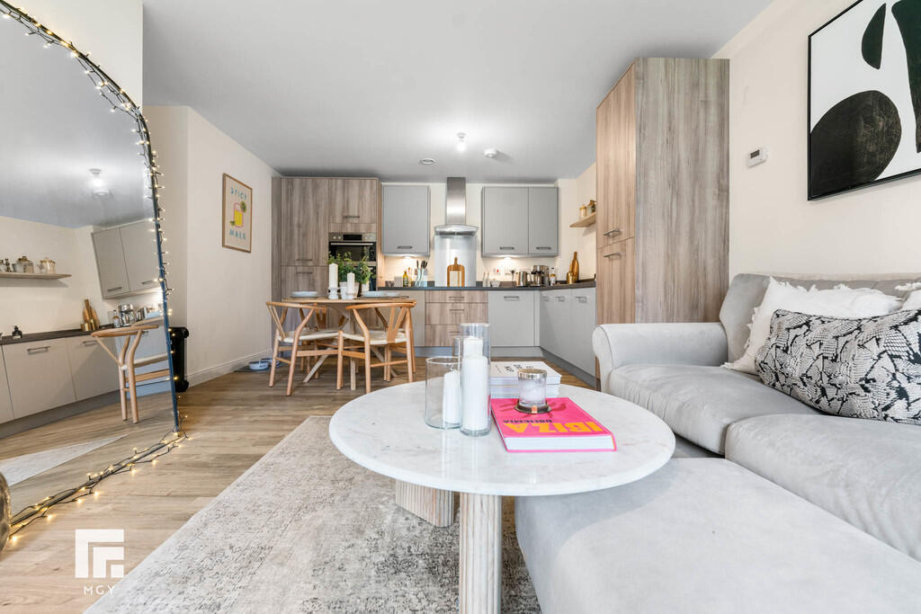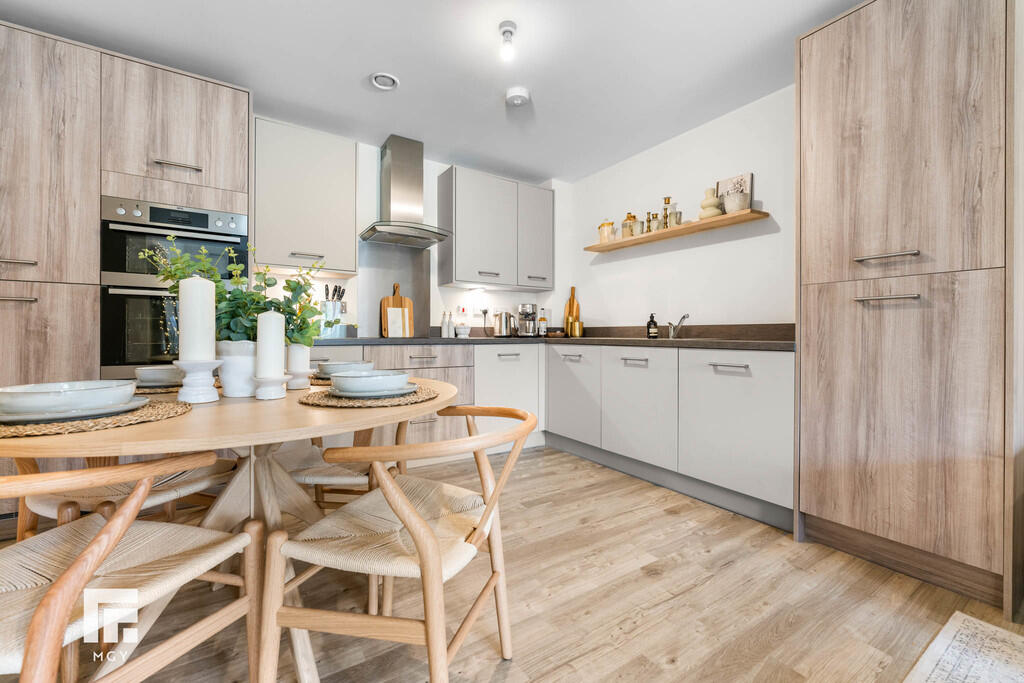 LOUNGE/KITCHEN/DINER21' 11" x 13' 1" (6.69m x 4.01m) A large open plan living space with french doors to the glass framed Juliet balcony. Ample space for seating and dining table. The kitchen is well appointed along two sides in matte finish and woodgrain effect fronts beneath laminate worktop surfaces. Inset 1.5 bowl stainless steel sink with side drainer. Inset four ring induction hob with curved glass cooker hood above. Integrated oven and grill. Integrated fridge freezer. Integrated washing machine. Matching range of eye level wall cupboards.