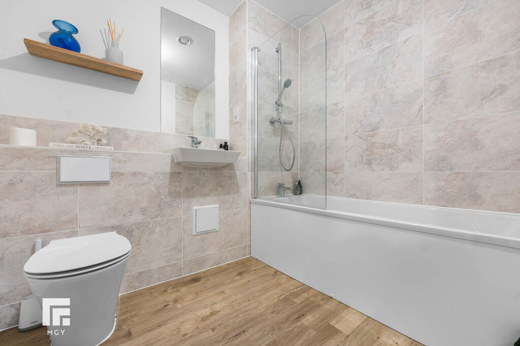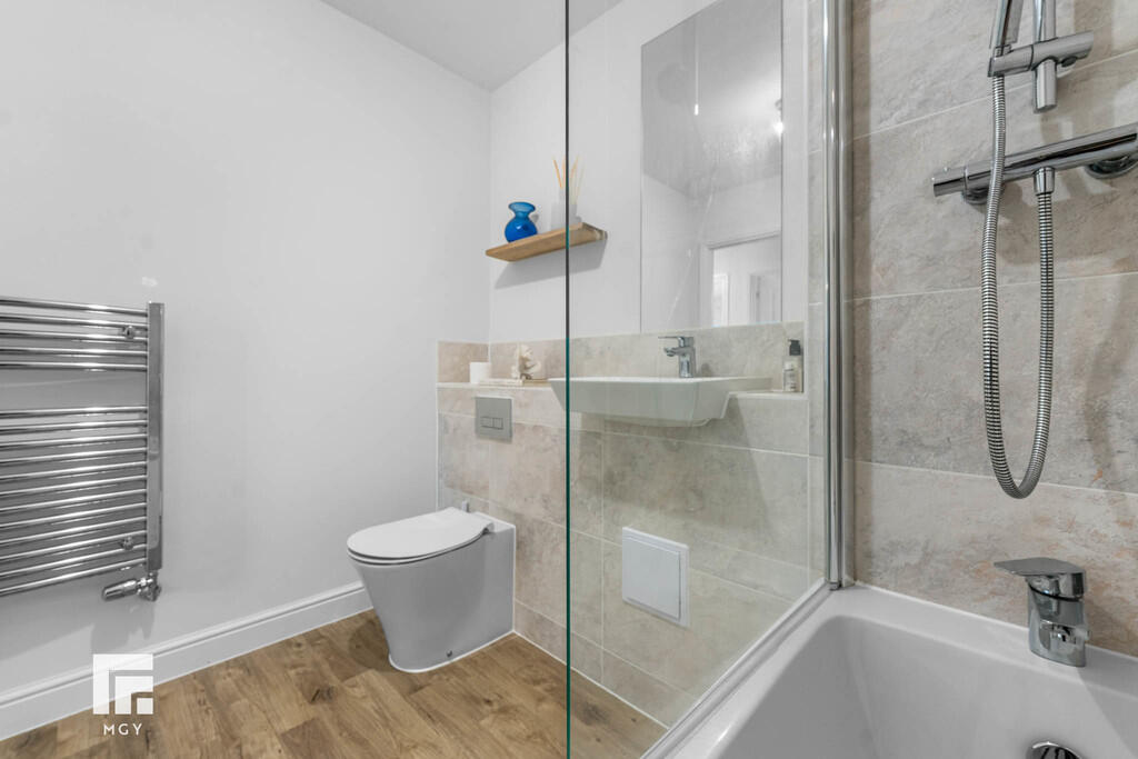 FAMILYBATHROOM7' 7" x 6' 7" (2.32m x 2.02m) Modern white suite comprising low level wc, wash hand basin, panelled bath with chrome shower above. Tiled splash back. Electric shaver point. Extractor fan. Heated towel rail.
