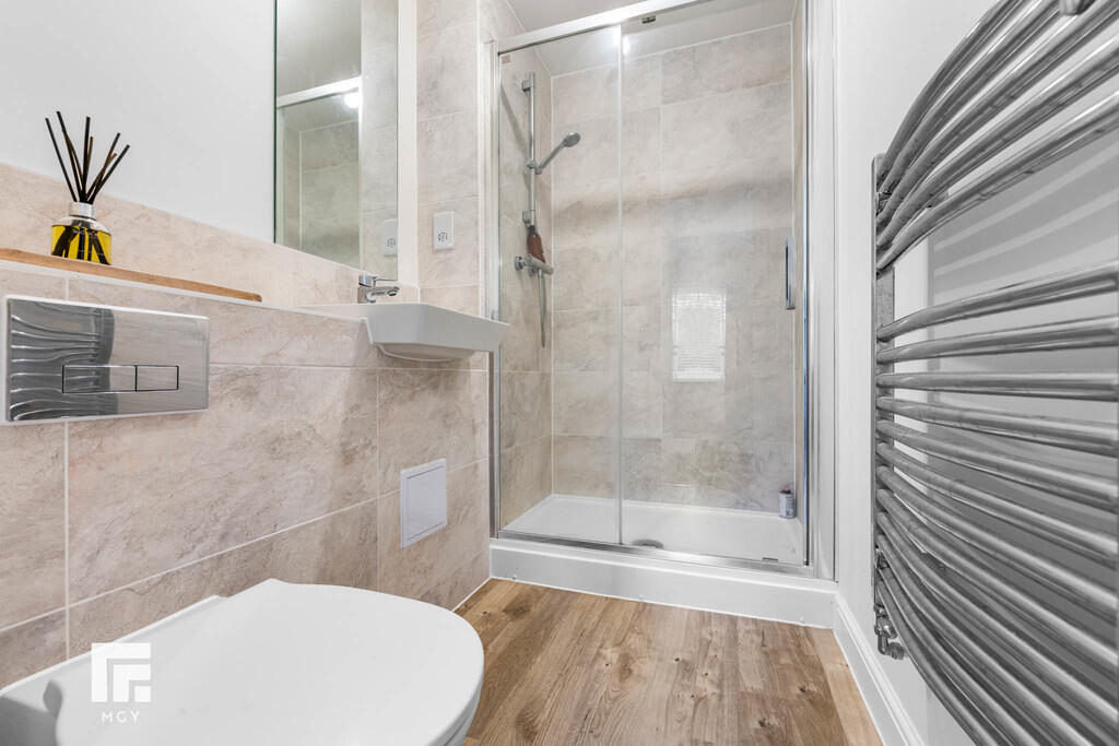ENSUITESHOWERROOM7' 4" x 4' 8" (2.25m x 1.44m) Quality white suite comprising low level wc, wash hand basin, large shower cubicle. Wall tiling to splash back areas. Electric shaver point. Chrome heated towel rail.